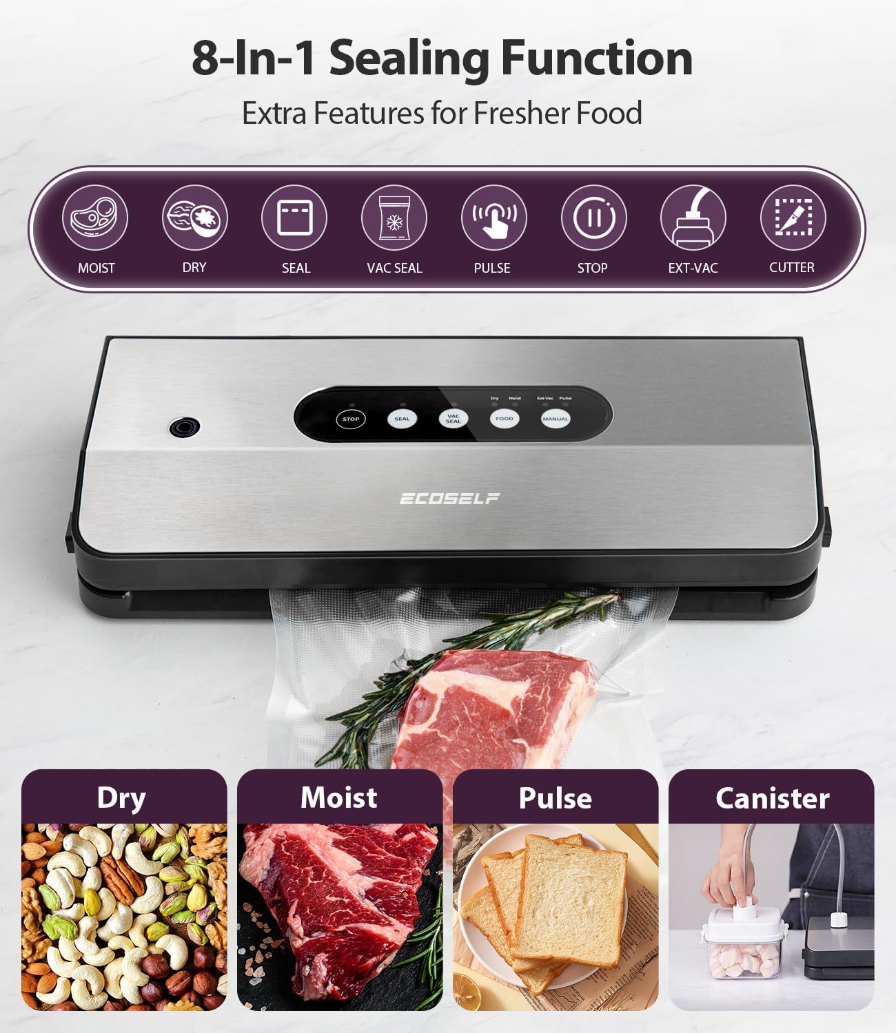 Vacuum Sealer Machine, with 8-in-1 Function& Detachable Tray& Cutter& 10 Bags, Food Vacuum Sealer Saver Machine for Food Storage & Sous Vide,Automatic Sealing Machine,EXT-VAC,Stainless Steel