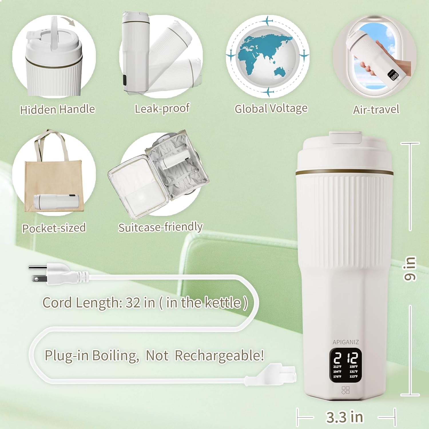 【Friendly Reminder】Equipped with a 32-inch power cord (in the kettle), the mini kettle requires plugging in to boil water. Not Rechargeable!