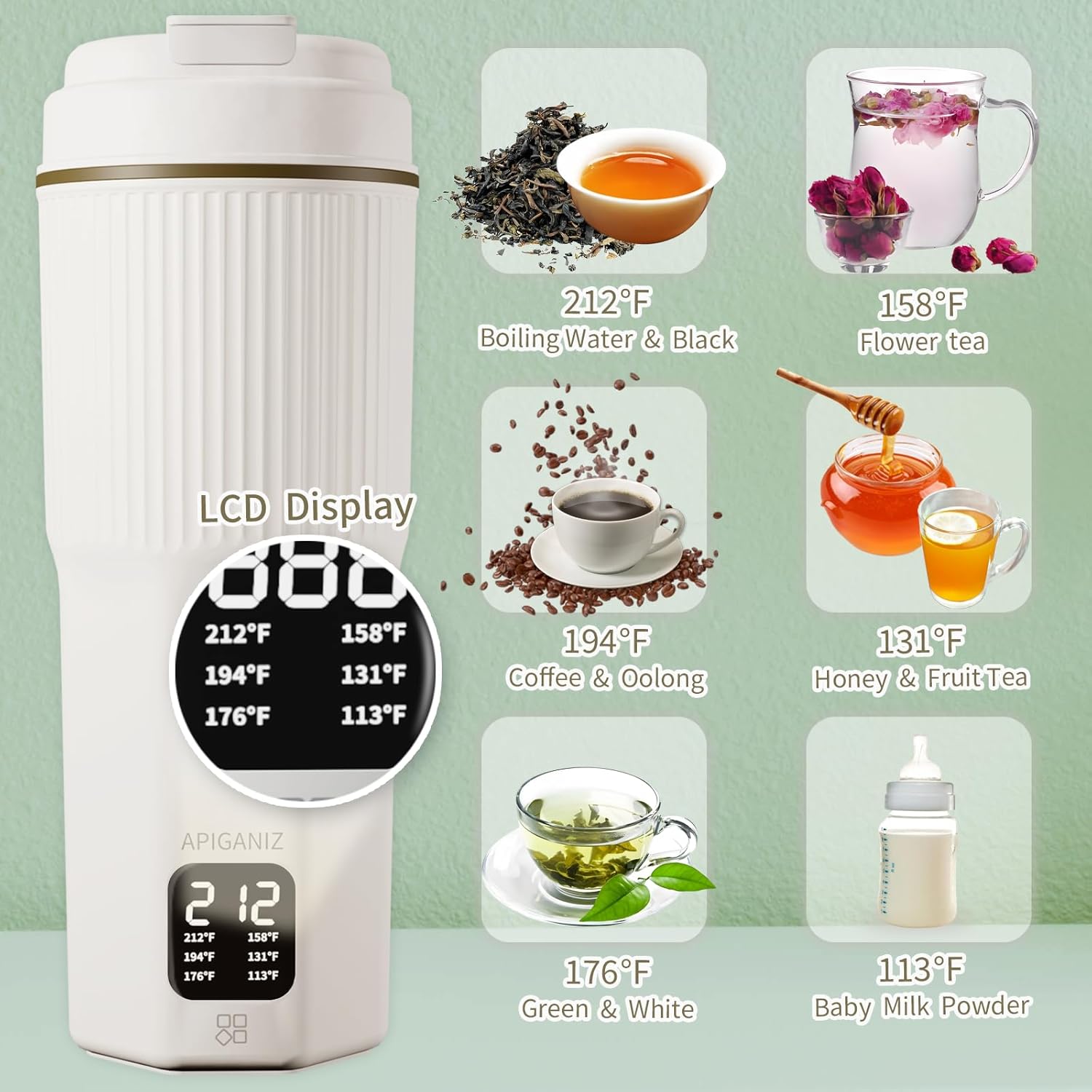 【Smart & Convenient】Equipped with an LCD display, 6-level temperature control, and plug-in insulation function, this portable electric kettle offers precise heating and fast boiling speed, boiling water in just 6-8 minutes. Its double-layer insulation prevents scalding, while the seamless inner liner makes cleaning a breeze.
