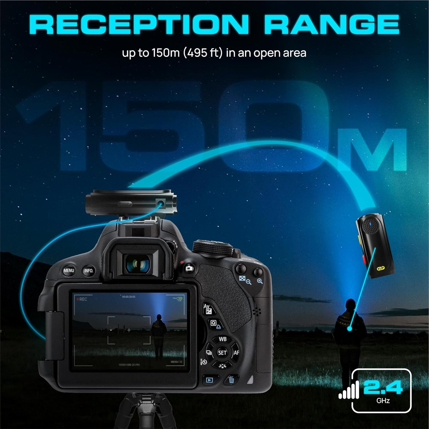 πŸ”­ The wireless microphones and receiver operate at a frequency of 2.4GHz, providing a signal reception range of up to πŸπŸ“πŸŽ πŒπ„π“π„π‘π’ (πŸ’πŸ—πŸ“ 𝐅𝐄𝐄𝐓) in an open area. Thanks to Adaptive FM technology, even in crowded environments, the bluetooth microphone will operate on the most available channel, ensuring no data packet losses during transmission from the mini microphone to the receiver. (lav mic, small microphone, microfono para iphone, lapel microphone, microphone wireless)