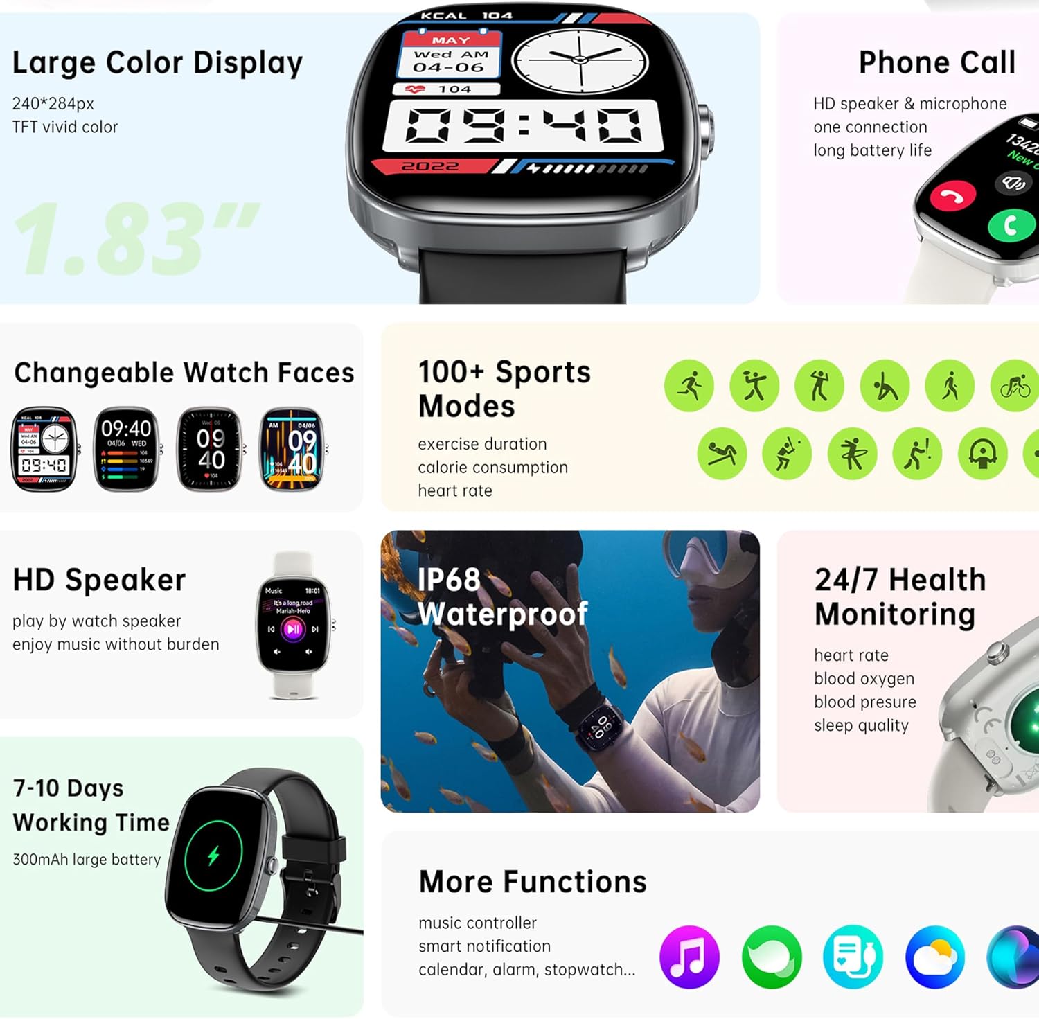 1.83″ Smart Watch for Women Men(Make/Answer Call), 2024 New 5ATM Waterproof Mens Smartwatches, Fitness Tracker Smartwatch for Android iPhones, Digital Watches Step Counter, 3 Straps, Comes with 1 Stainless Steel Watch Band, 1 Leateher Watch Band and 1 Silicone Watch Band