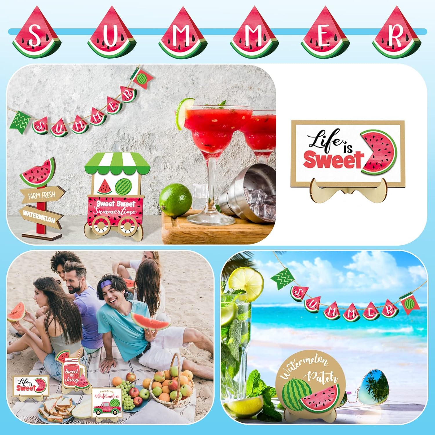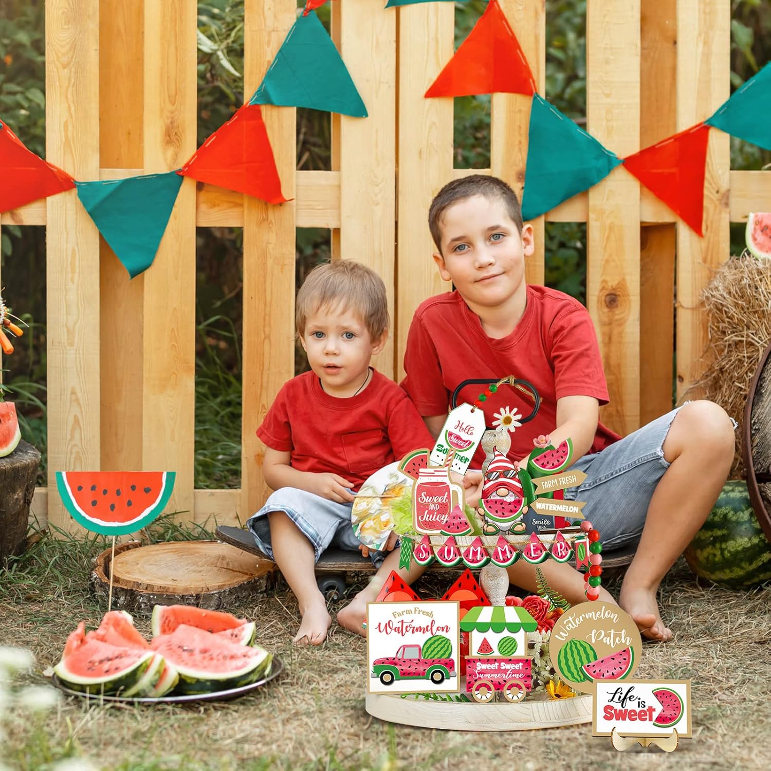 16 Pieces Summer Tiered Tray Decor Watermelon Tiered Tray Decor Set Hello Summer Watermelon Mini Wood Table Top Sign Rustic Farmhouse Decor for Home Kitchen Table Decorations (Watermelon)