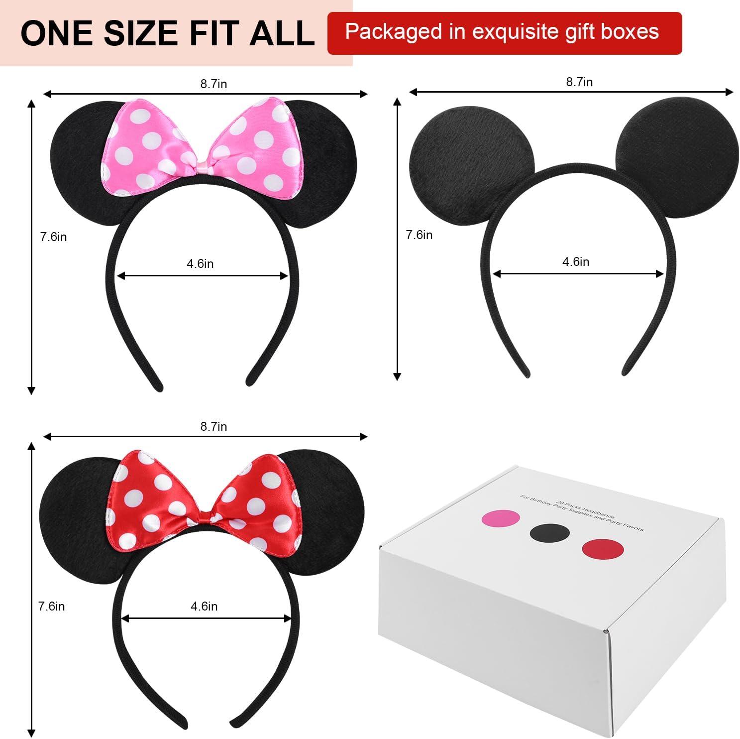 COLORS: Come with 20 pcs Mouse Ears Headbands in 2 style (10 black ears without bow for boys, 10 pink ears with pink bow for girls )