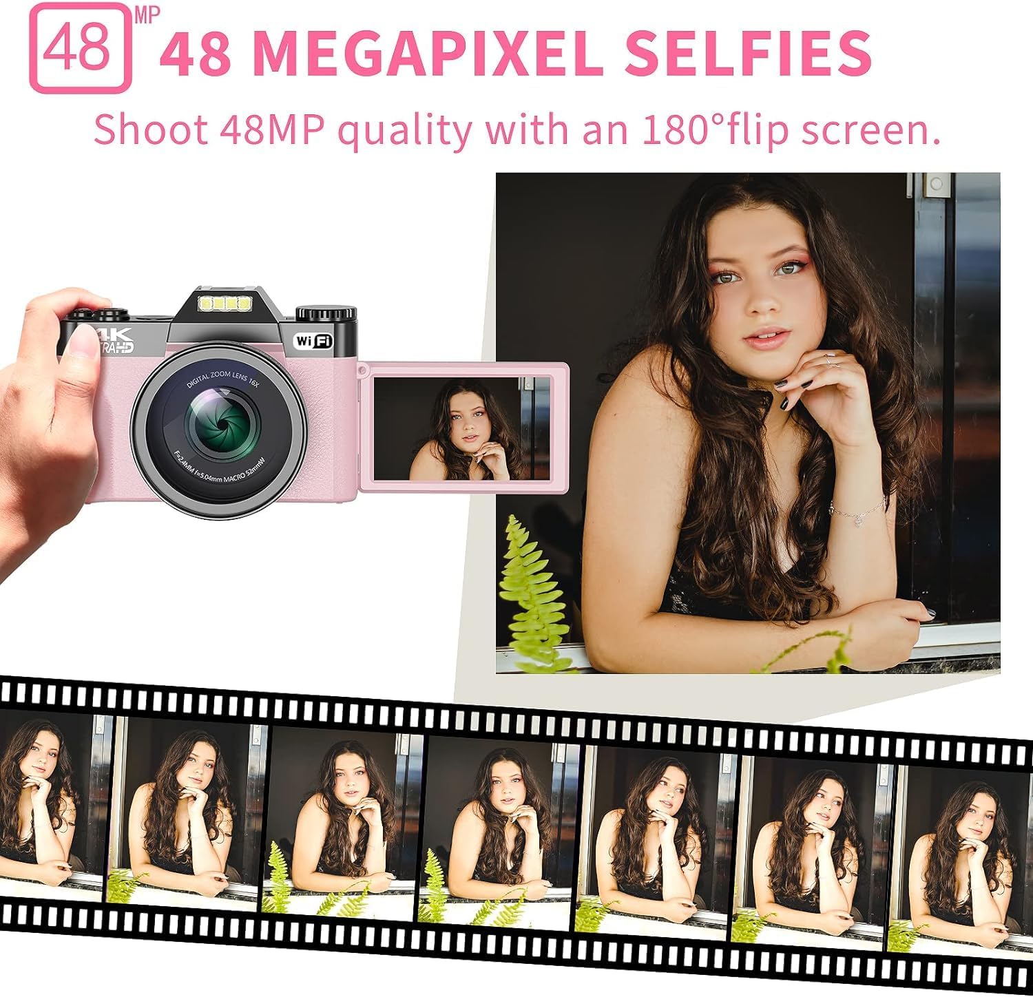 2024 Upgrade 4K 56MP Digital Camera for Photography UIKICON Vlogging Camera with 180° Flip Screen, WiFi,16X Digital Zoom, 52mm Lens, 2 Batteries, 32GB TF Card(XJ-Pink1)