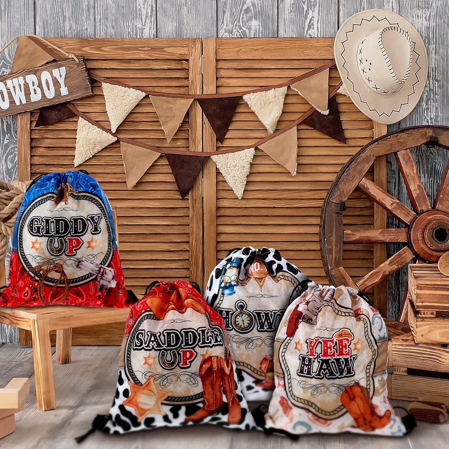 Classical Cowboy Theme Elements: these drawstring party favor bags are designed with many classical western cowboy elements, such as cowboy hats, boots, wheels, cow skulls, and so on, full of cowboy style, making your cowboy themed party more delightful and memorable