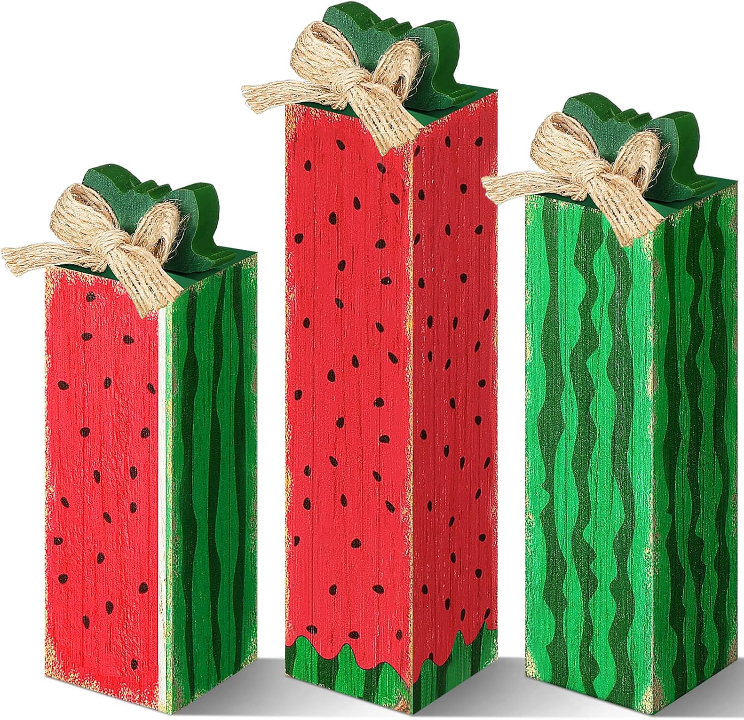 Features: Where to apply: Our summer decoration enhances any space, whether it’s a desk, bookshelf, coffee bar or fireplace. Appropriate for both homes and offices, these pieces impart an exquisite, simple and beautiful scenery to your surroundings. Meaningful and practical gifts: Show your thoughtfulness by gifting our watermelon centerpieces for tables to family, colleagues, and veterans on special occasions. It’s a heartwarming way to show your care and express sympathy. Specifications: Material: wood Color: green, red, black Size: about 3.74 x 1.38 inches, 4.53 x 1.38 inches, 5.31 x 1.38 inches Package includes: 3 x Watermelon wooden block Notes: Manual measurement, please allow slight errors on size. The color may exist a slight difference due to different screen displays.