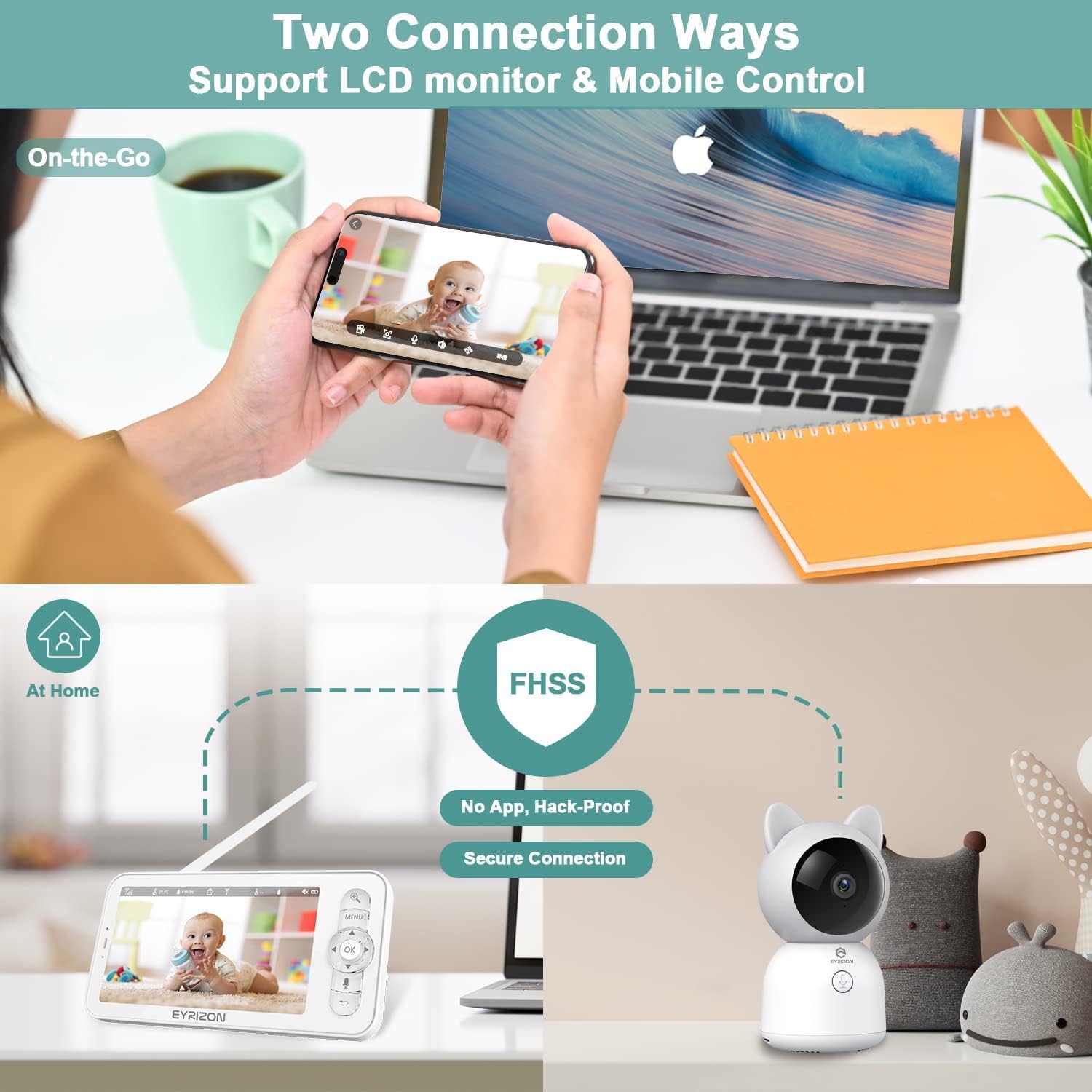 【📶𝑳𝒐𝒏𝒈 𝑹𝒂𝒏𝒈𝒆 & 360° 𝑵𝒐 𝑩𝒍𝒊𝒏𝒅 𝑨𝒓𝒆𝒂】1000ft Range Coverage, baby camera pan 340° and tilt up and down 55° for a wide 110° view floor to ceiling, which can make it easier for you to see what’s going on and monitor every corner of your home. Via 720P color screen No Wi-Fi or App Pairing, secure internal 2.4GHz channel with FHSS technology, so you can rest assured that you’re the only one who can hear and see your baby, privacy is guaranteed