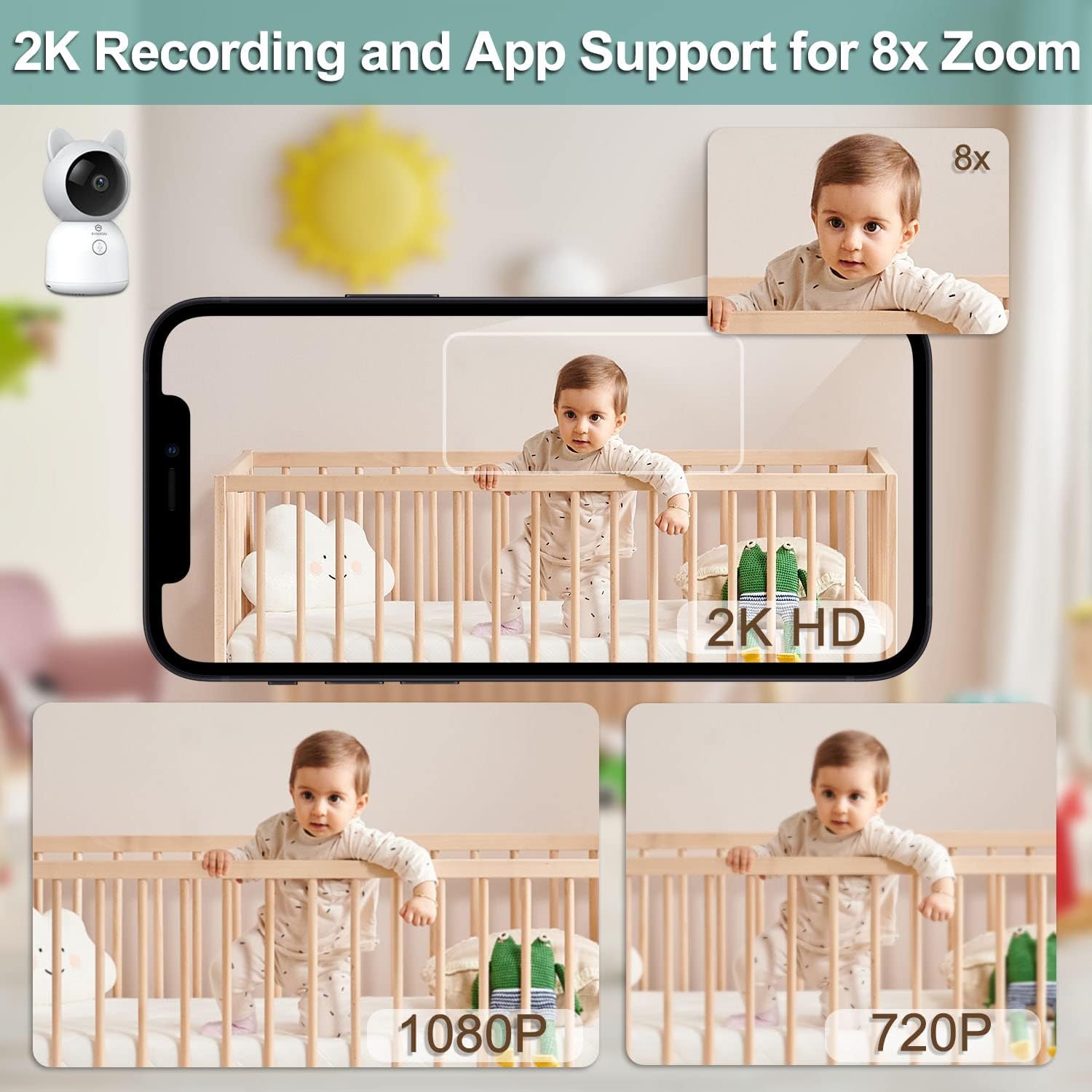 【📷𝑼𝒑𝒈𝒓𝒂𝒅𝒆𝒅 2𝑲 𝑪𝒂𝒎𝒆𝒓𝒂 & 📱𝑪𝒐𝒎𝒑𝒂𝒕𝒊𝒃𝒍𝒆 𝑷𝒉𝒐𝒏𝒆𝑨𝒑𝒑】2K camera allows you to 8X zoom in more clearly to see more of your baby’s cute expression changes. While you can via App or the 5-inch Display to take pictures or record videos and share wonderful moments with other family members. Support SD Card Storage (Max 128G), record more precious baby videos or screenshots, and save beautiful memories
