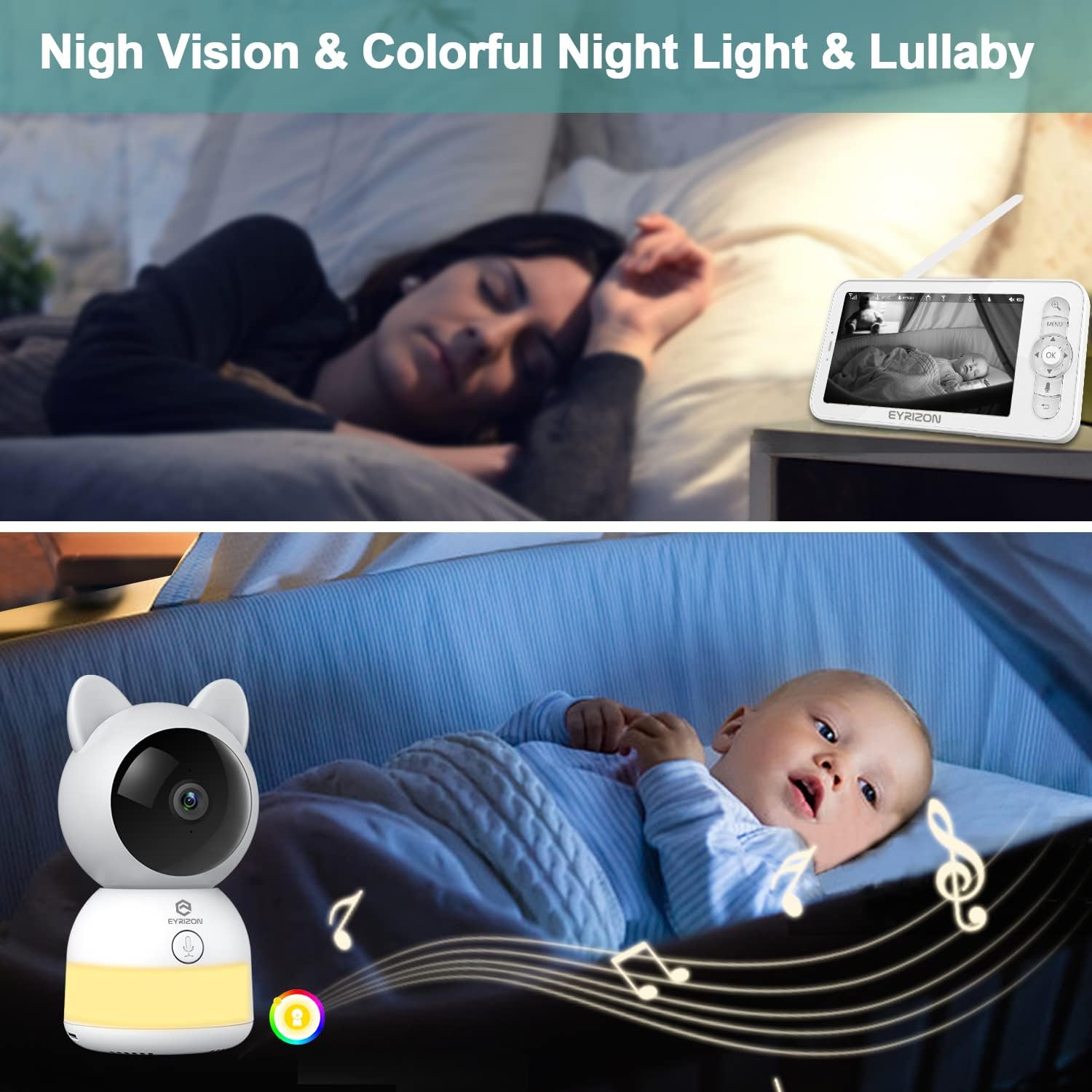 【🌙𝑵𝒊𝒈𝒉𝒕 𝑽𝒊𝒔𝒊𝒐𝒏 & 🎶𝑳𝒖𝒍𝒍𝒂𝒃𝒚 𝑷𝒍𝒂𝒚𝒆𝒓】Baby Camera with Adjustable Night Light can clearly view your baby at night, and nighttime check-ups made easy. 💡Adjustable Colorful Night Lights and Lullabies with soothing sounds not only put baby to sleep but also are good companions for mothers during midnight feedings