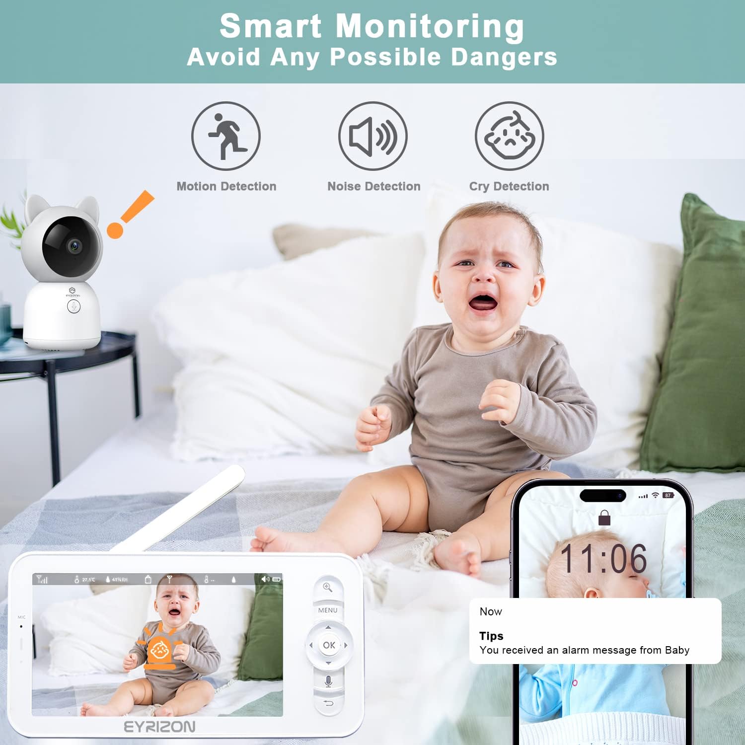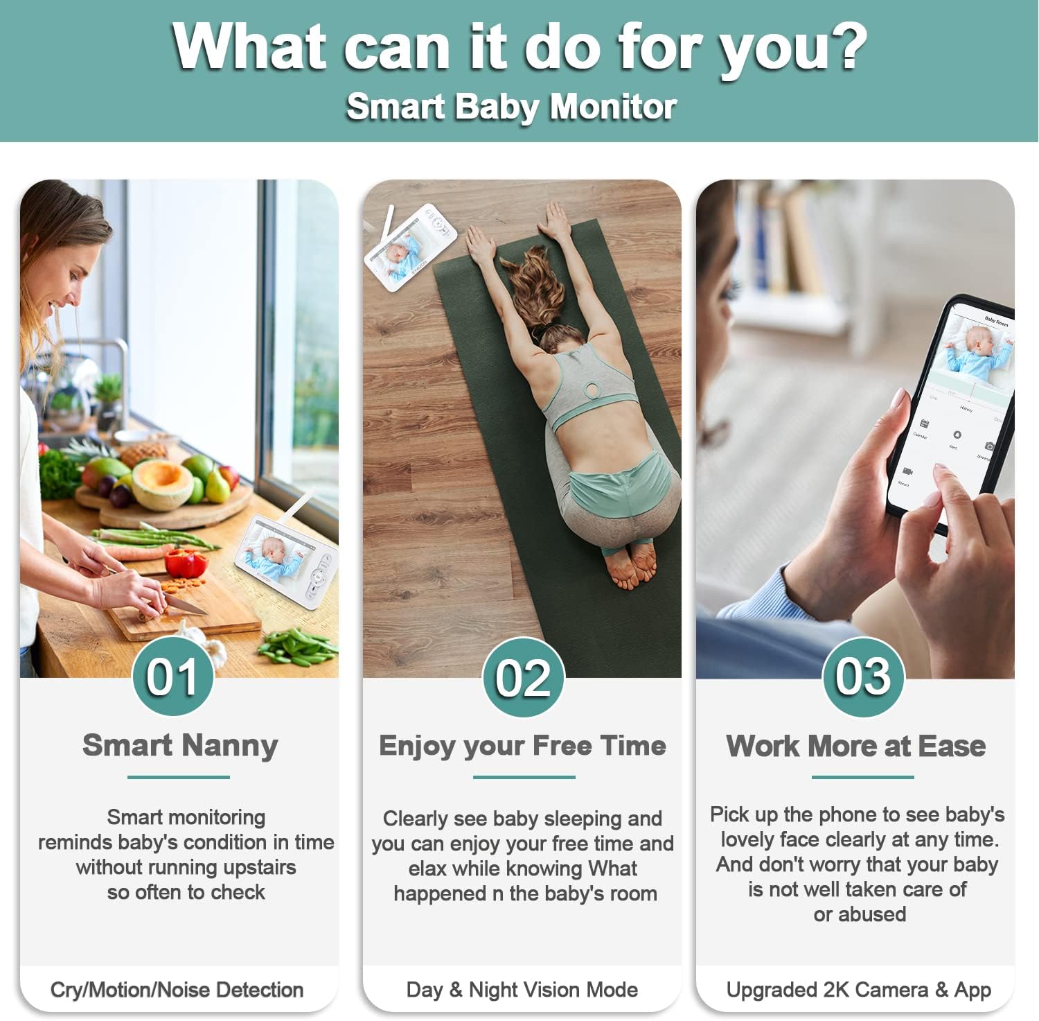 【🔆𝑺𝒎𝒂𝒓𝒕 𝑵𝒂𝒏𝒏𝒚】-1) Equipped with smart motion/crying/noise detection, and danger zone detection. You could pre-set a safe area for your crawling baby to stay within and receive an immediate alert if they leave the safe area. 2) Temp & Humidity Detection and Feeding Reminder: Monitor the environment where the baby is located and help you feed the baby at a fixed time to avoid the baby crying