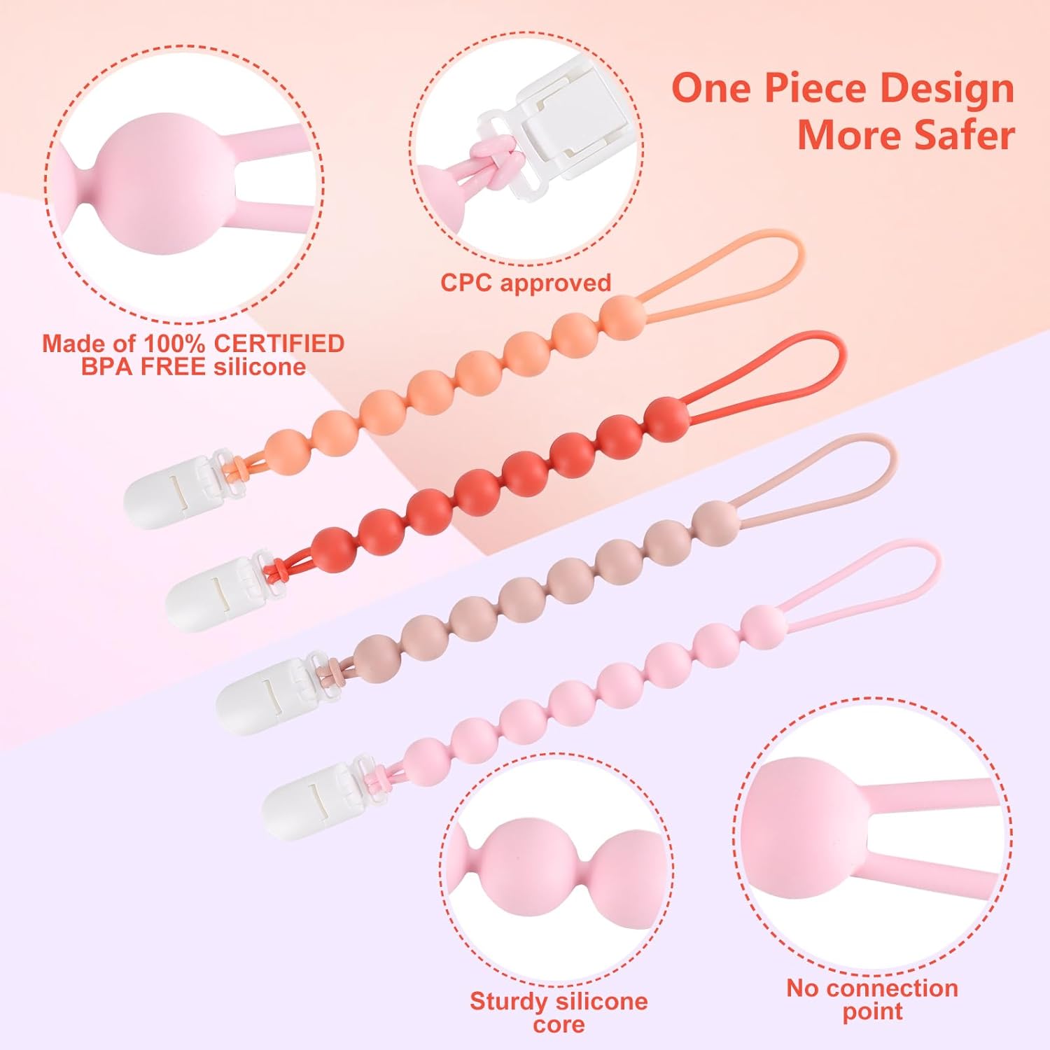 4-Pack Silicone Pacifier Clips for Baby Boys and Girls – with One-Piece Beads, Flexible and Rust-Free Holders for Teething Relief and Baby Essentials – Safe for Newborns (Pink)
