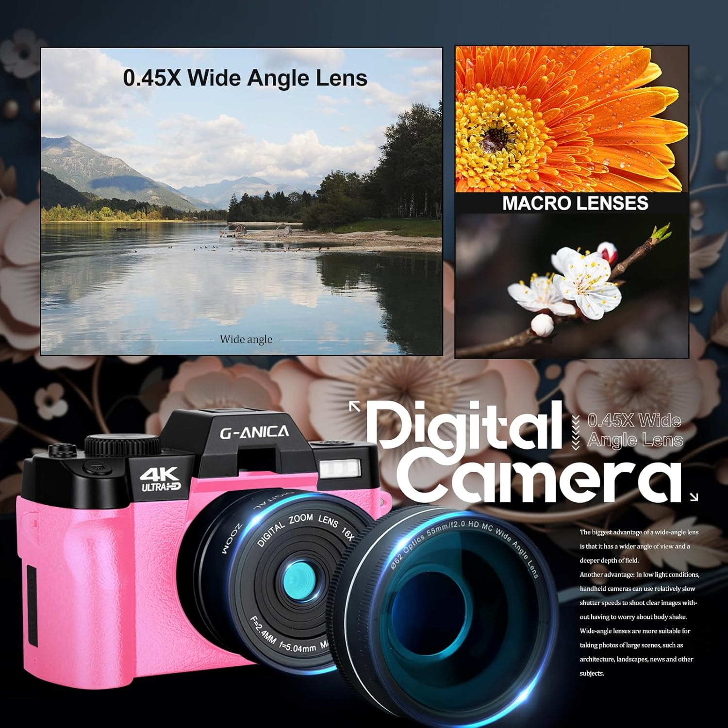【Wide Angle & Macro Lens Camera】:The 4K digital camera is equipped with professional detachable 52mm wide-angle lens and macro lens, so this camera is very suitable for easily capturing a wide field of vision, and macro lens captures the diversity of small world. Help you record more beautiful moments in life. Make taking photos even more interesting