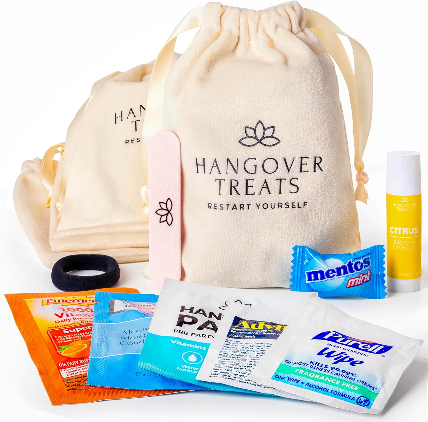 FEELING AND LOOKING FRESH: We All Know How Late Nights Can Make You Wake Up With Bad Breath, Old Makeup and Baggy Eyes. We Added a Premium Makeup Remover Wipe, a Freshening Mint, a Moisturizing Lip Balm, a Hair Tie, a Nail File and an Energizing Electrolytes + Vitamin C Powder in This Hangover Supplies Kit to Ensure the Group Feels Fresh and Clean to Get Going the Next Day.