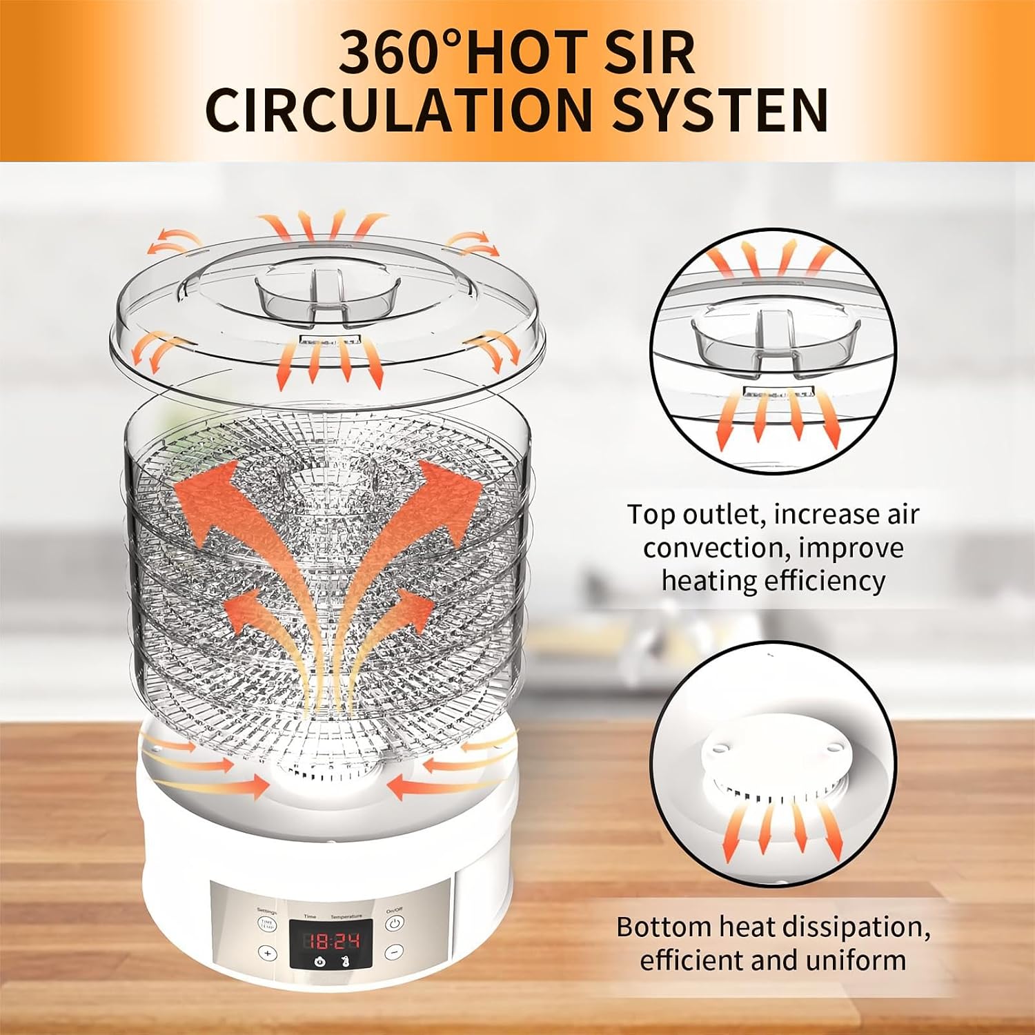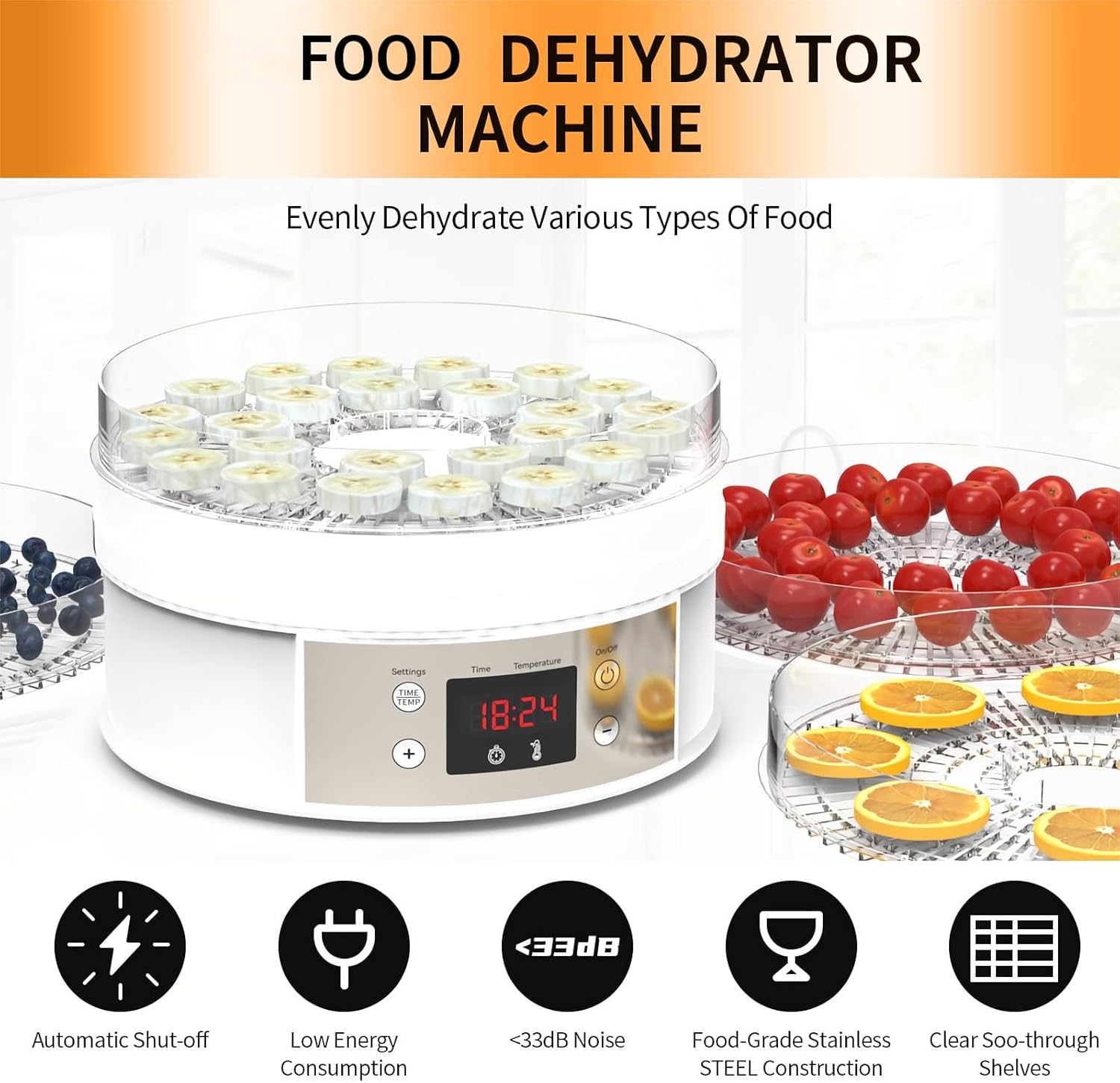 🍓 5 LAYERS OF TRAYS – This food dehydrator is designed with 5 large-capacity food-grade drying racks, which are enough to hold most food items and achieve uniform drying; 5 trays provide the ultimate convenience for classifying different food and improving productivity.