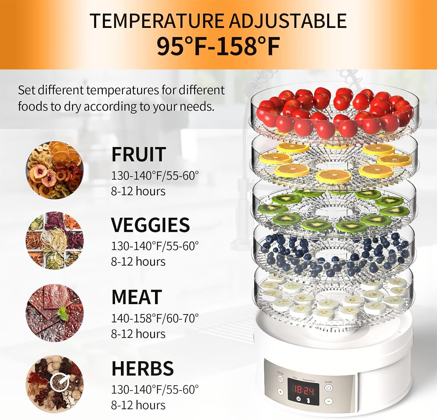 🍋PRECISE TIMING AND TEMPERATURE – The upgrade from the button to the number button is to better control the timing and ensure the fresh taste of the food. Time ranges from 1 to 72 hours, and select temperatures from 95-158 ° F / 35-70 ° C (95º F-158 ºF), allowing you to dry different types of food at appropriate and accurate temperatures. It’s the perfect way to preserve food.