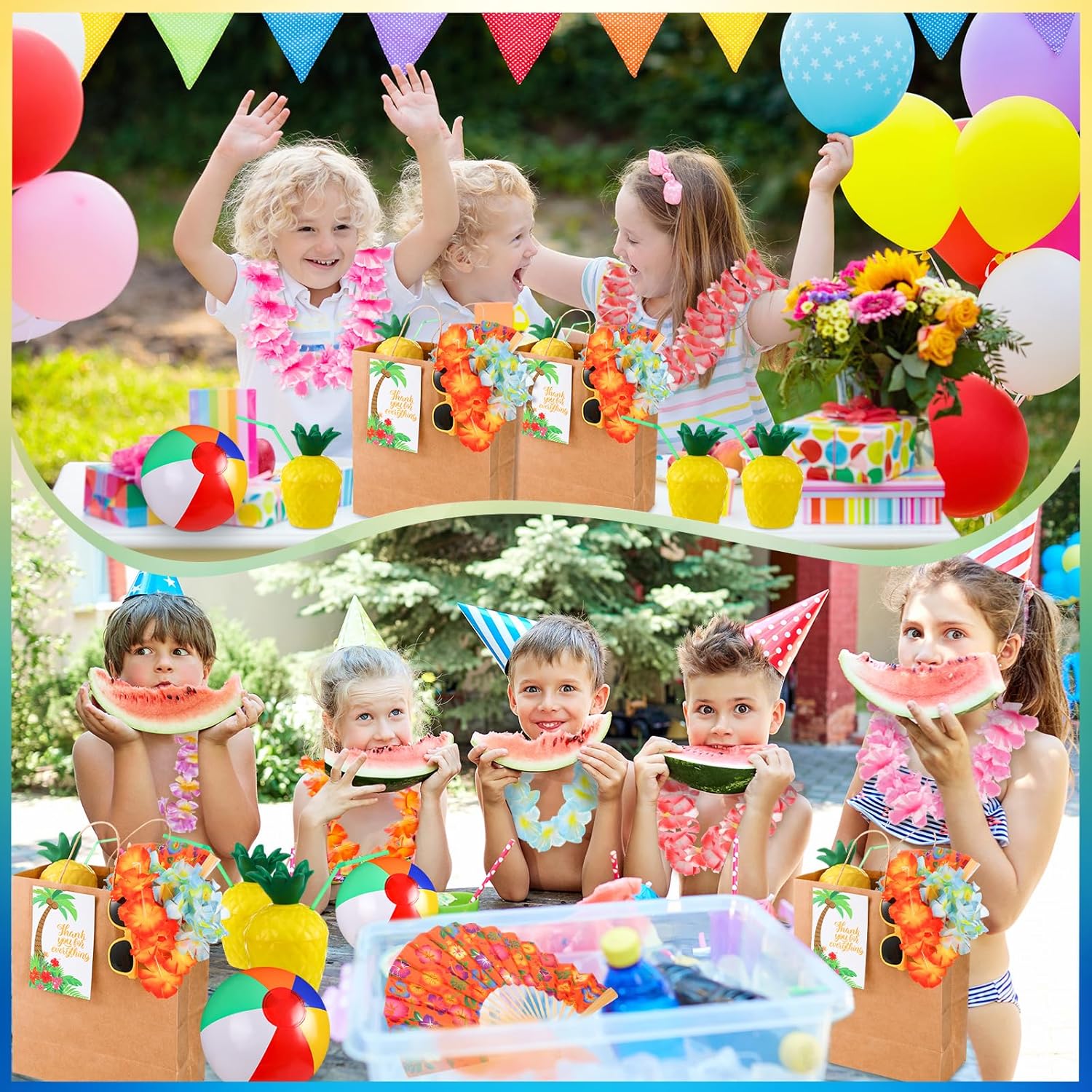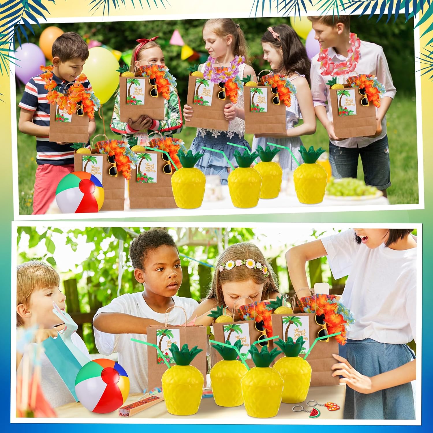 54 Pcs Pool Party Thank You Bag Set Hawaiian Luau Party Favors with Pineapple Cups Gift Bags Card Hawaiian Leis Beach Ball Sunglasses Hibiscus Fan Keychains for Summer Beach Party Supplies