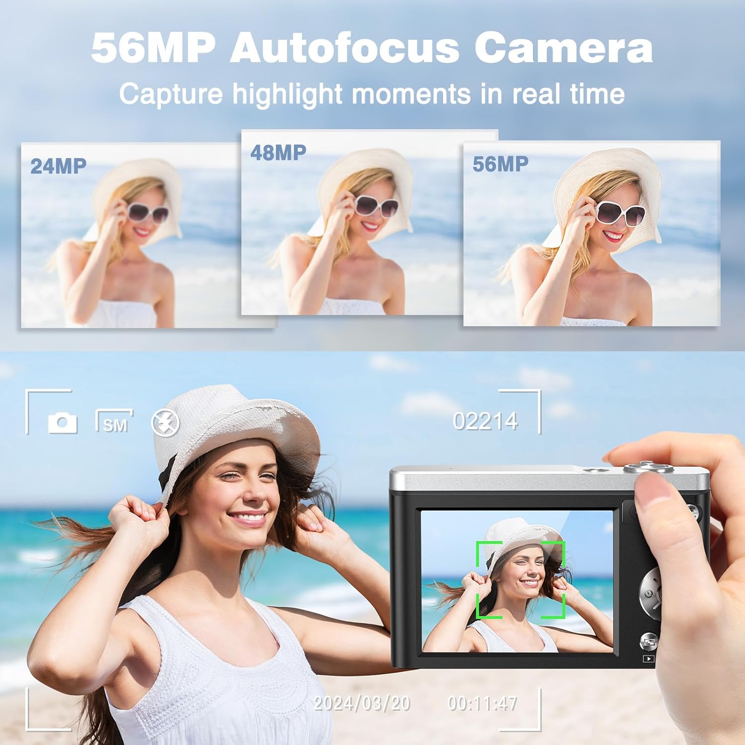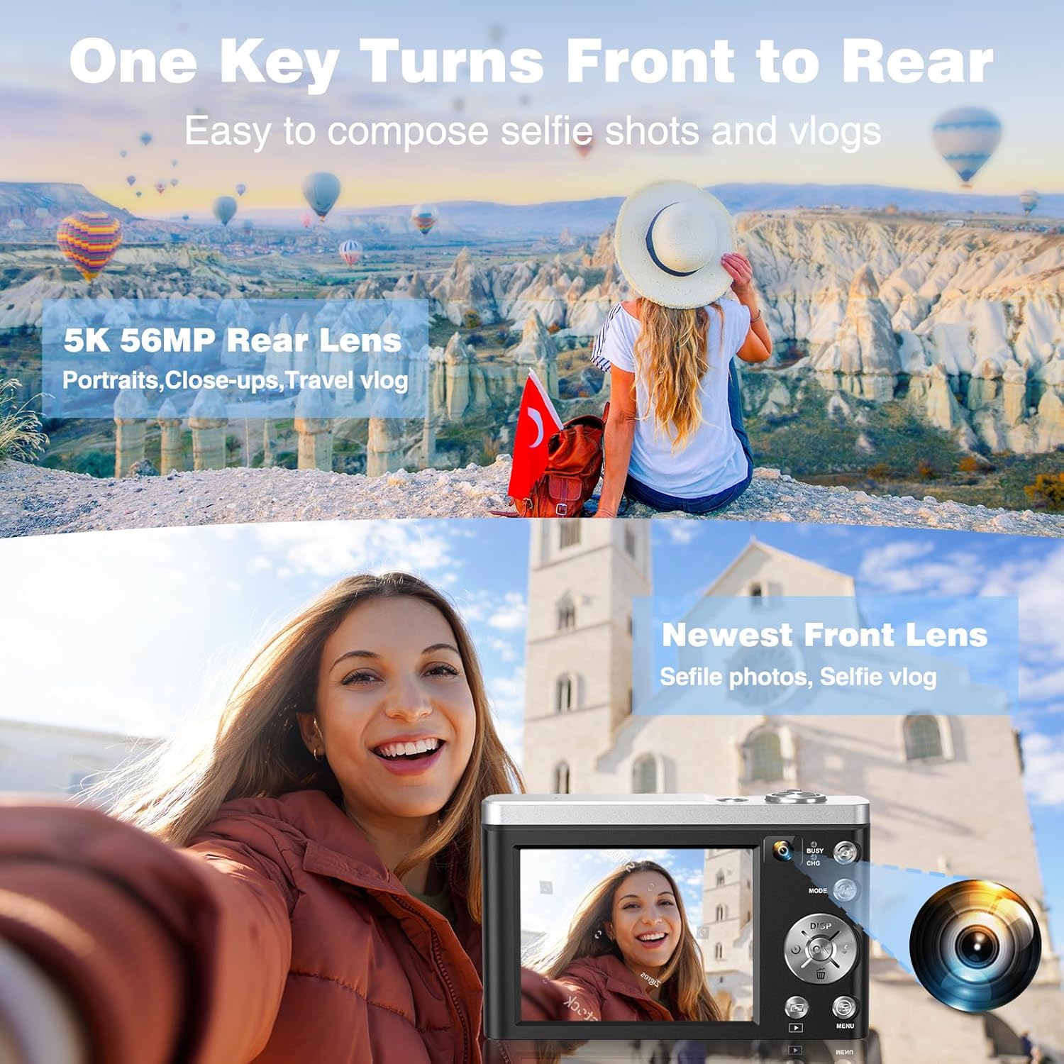 5K Digital Camera 2024 Upgraded 10X Optical Vlogging Camera with Front and Rear Lens, 56MP AutoFocus Cameras for Photography, Touch Screen, Flash, Compact Travel Camera with 64GB Card, 2 Batteries