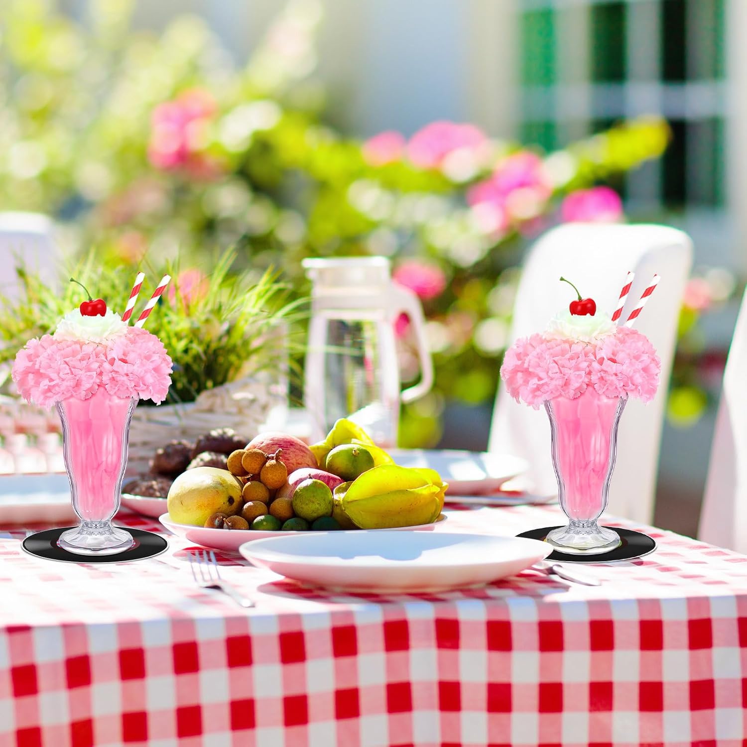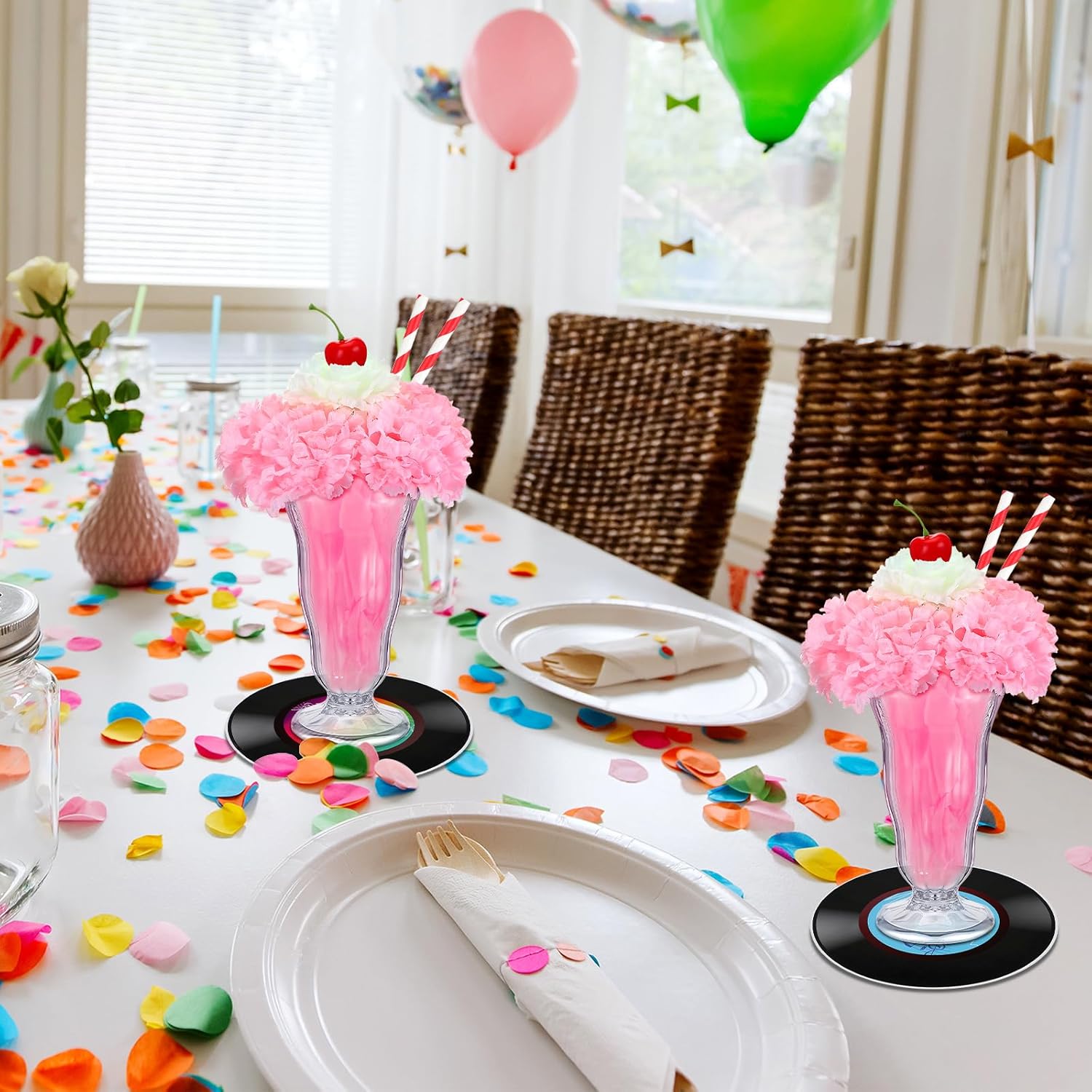 6 Sets 50’s Soda Shop Party Decor 50’s Theme Party Decorations Includes 6 Soda Glass 10 Straws 36 Artificial Carnation Flowers 6 Cherries 6 Records 6 Crepe Paper for 50’s Party Decorations