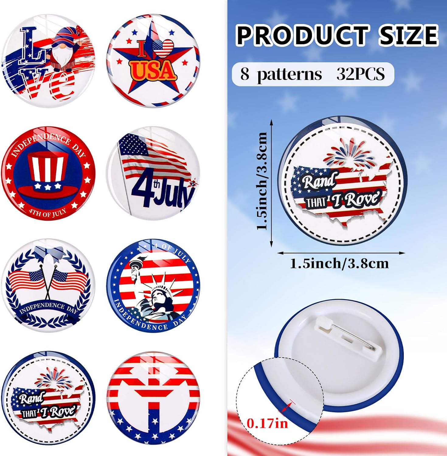 of July Party Favors Set: Package includes 32 patriotic button badge pins and 32 red white blue silicone bracelets. These exquisite fourth of July accessories have sufficient quantities and various styles,can meet your different needs, enough for family and friends to decorate and celebrate Independence Day party