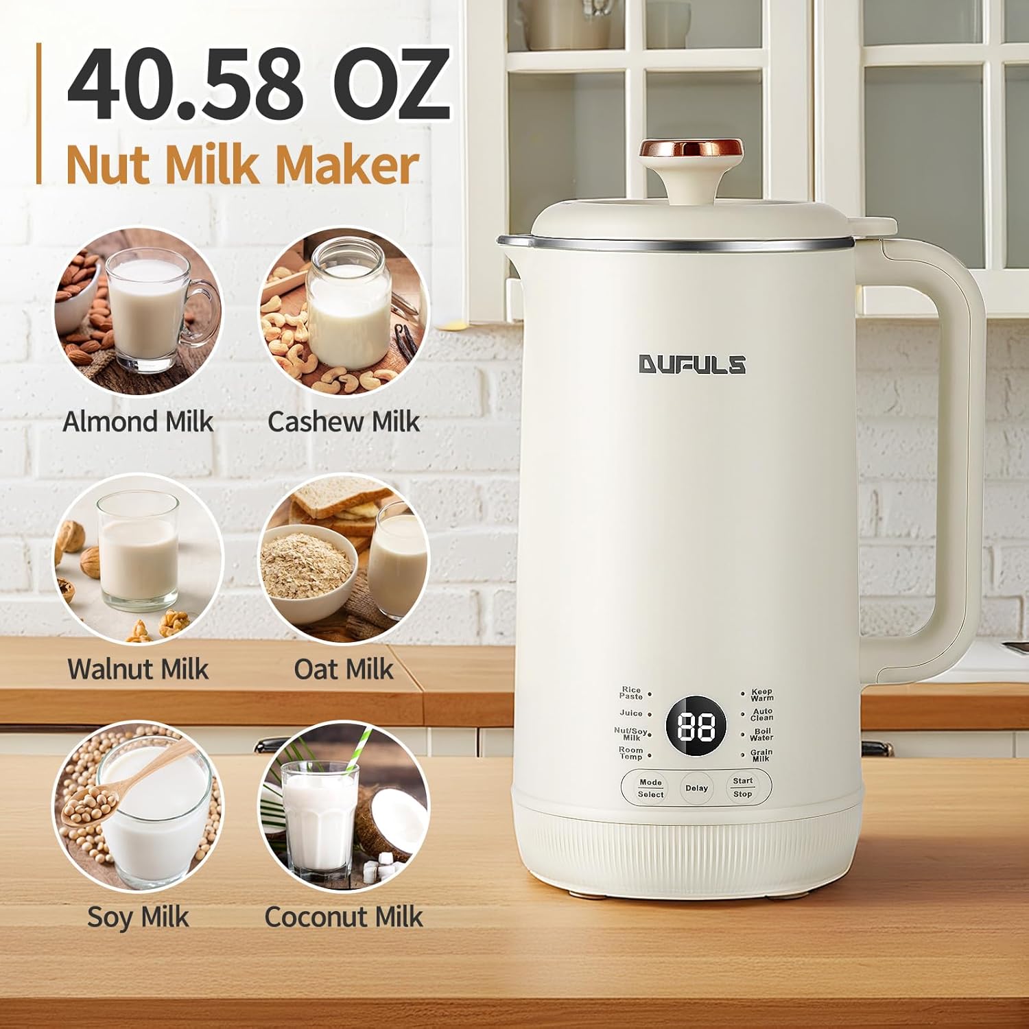 🍦🍦【Versatile 8-IN-1 Nut Milk Maker】Almond milk maker boasts 40.58oz large capacity that serves up to 4-5 people. There’re 8 basic mode for meeting your need(Rice Paste/Juice/Nut/Soy Milk/Room Temp/ Keep Warm/Auto Clean/Boil Water/Grain Milk).No need to pre-soak.Can be used to make a variety of plant-based milks, including almond milk, cashew milk, coconut milk, multigrain milk and more, catering to different dietary needs and preferences.