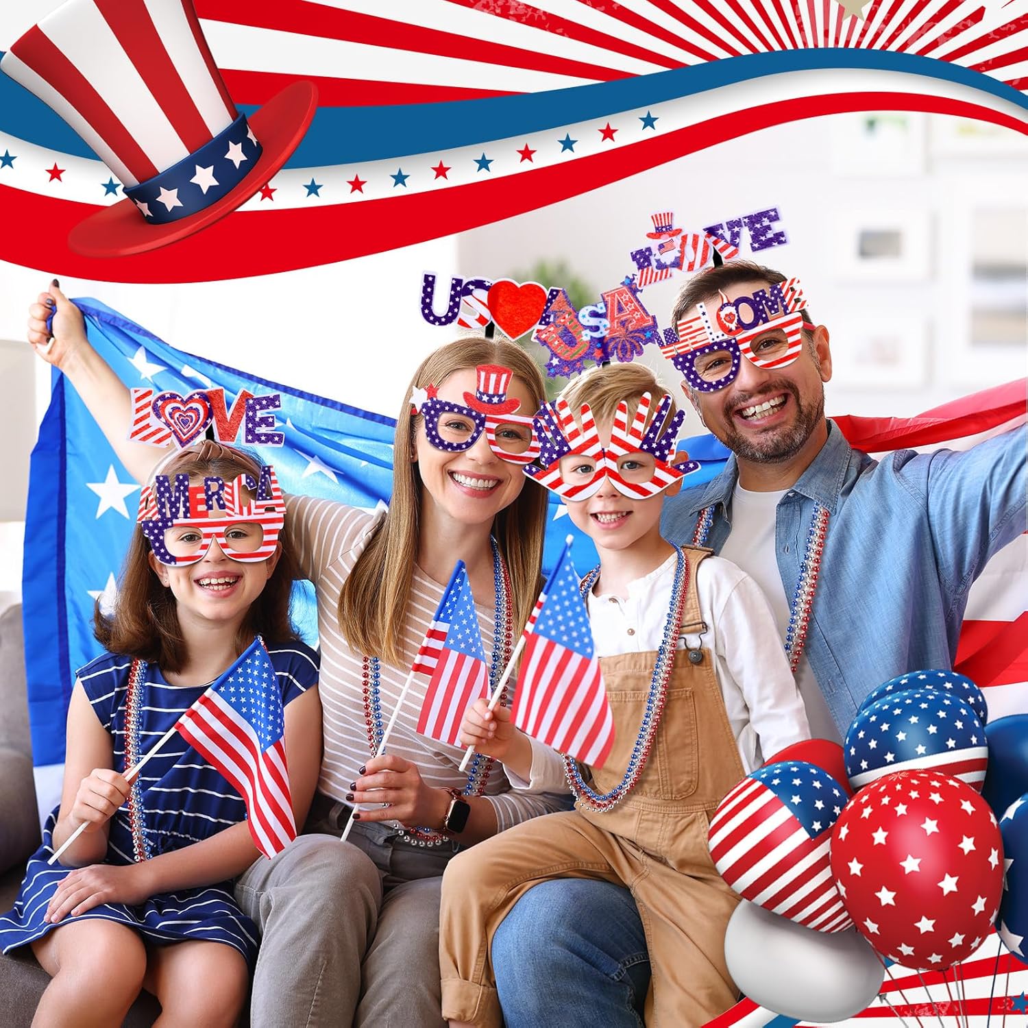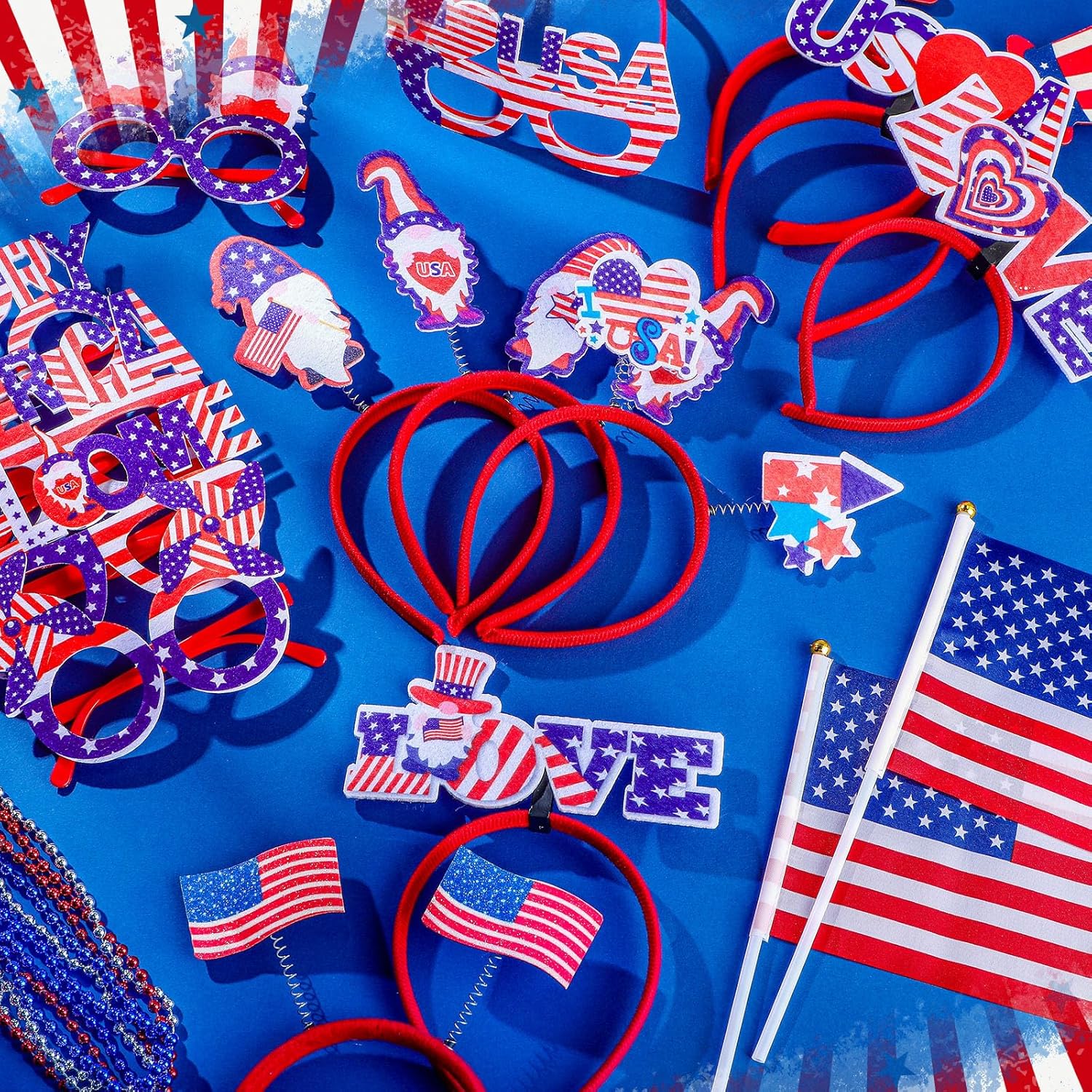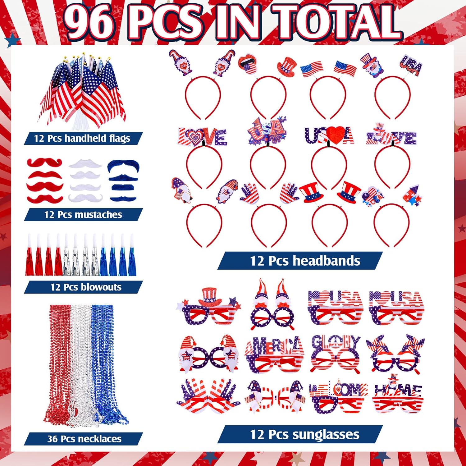 Independence Day Accessories: this set includes 12 sunglasses, 12 headbands, 12 handheld flags, 12 mustaches, 12 blowouts, and 36 beaded necklaces, totally 96 pieces; Sufficient quantity will meet your using needs, and you can share them with your family