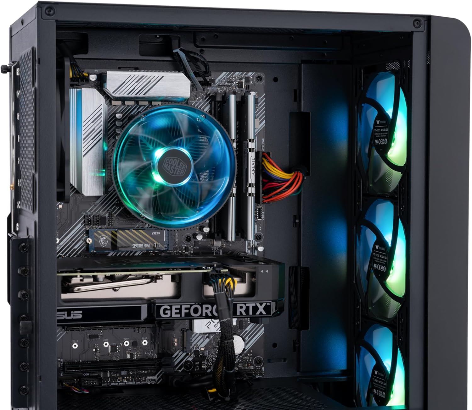 Operating System: Windows 11 Home CPU: AMD Ryzen 7 5700X 3.4GHz (4.6GHz Max Boost) 8-Core 16-Thread GPU: ASUS RTX 4060 TI 12GB GDDR6 DUAL Motherboard: ASUS Prime B550-Plus AC RAM: TeamGroup 32GB DDR4 3200MHz (2x16GB) SSD: MSI 1TB NVMe SSD CPU Cooler: RGB Air Cooler PSU: Thermaltake 600W 80+ Gold Case: ABS Stratos Obsidian Black WiFi: Yes Bluetooth: Yes VR Ready: Yes