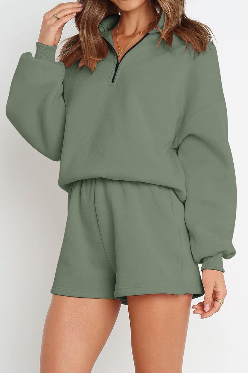 AUTOMET Long Sleeve Top and Shorts Pullover Cozy soft Lounge Pajama Set Loungewear Sweatsuits Tracksuit