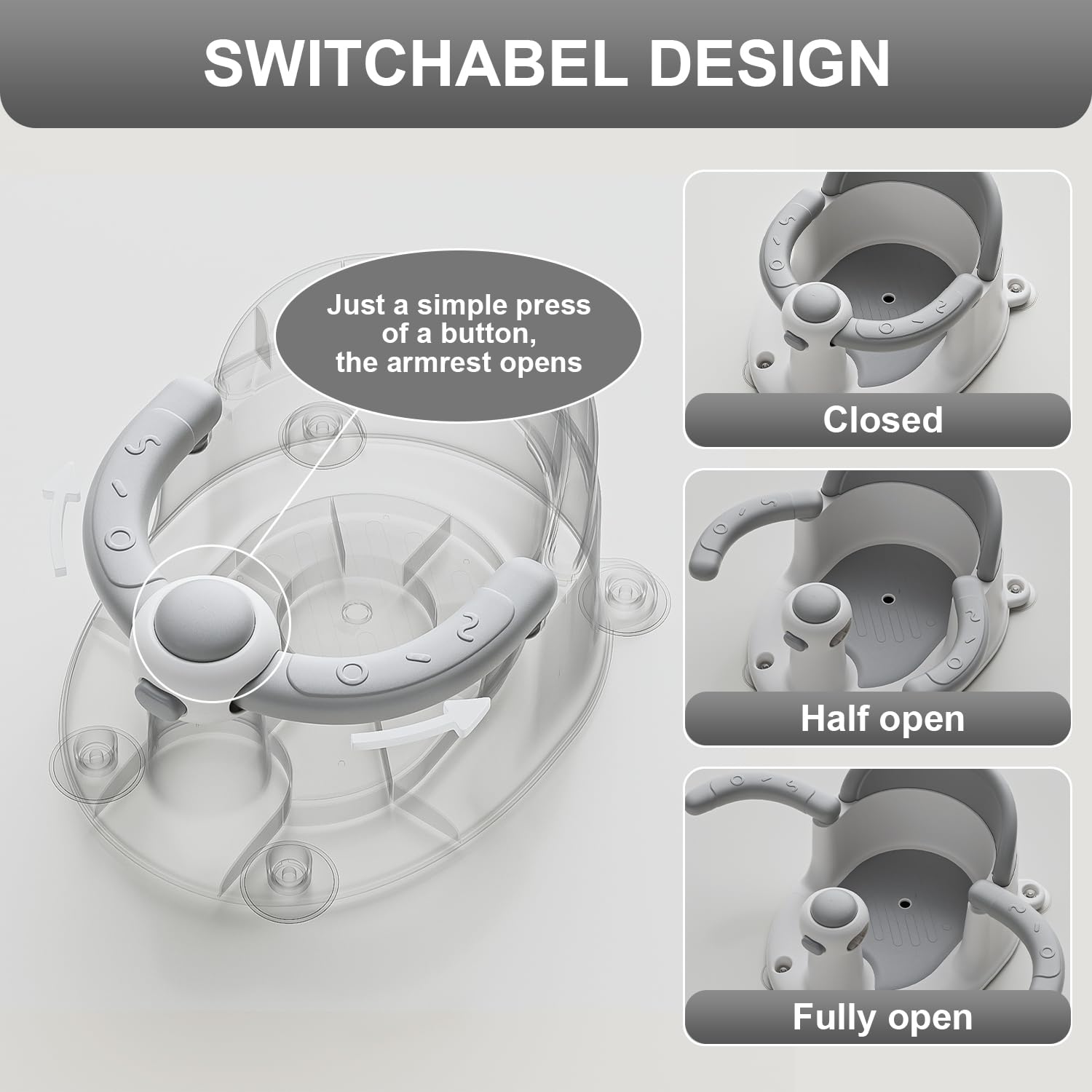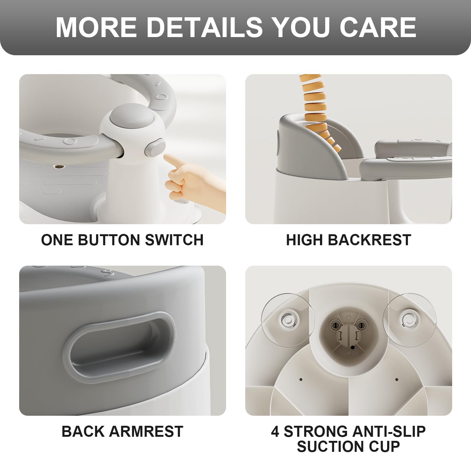 【Easy to Use & Clean】Our bath seat for babies 6 months & up features an intuitive opening and closing system. With just a simple press of a button, the armrest opens, making it seamless to place your baby in or take them out of the bath. It features materials that repel water and soap scum, making cleanup a breeze.