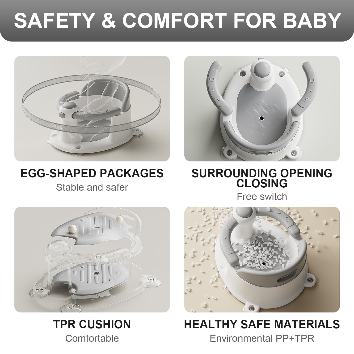 【Baby Bathing Ease】Designed for infants 6 months & up, our baby bath seat offers both fun and convenience during bath time. Free up mom’s hands, allowing for a more relaxed and enjoyable interaction with your child. It’s a game-changer for parents seeking a more relaxing bath time.
