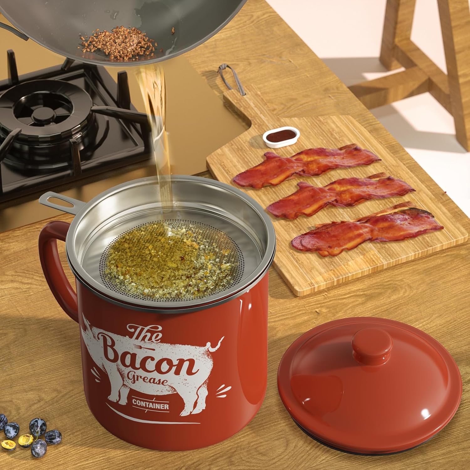 Bacon Grease Container With Strainer, 46OZ Large Enamel Grease Container, With Silicone Spatula, Farmhouse Bacon Grease Keeper, Cooking Oil Container For Kitchen Fat Storage, Dishwasher Safe-Red