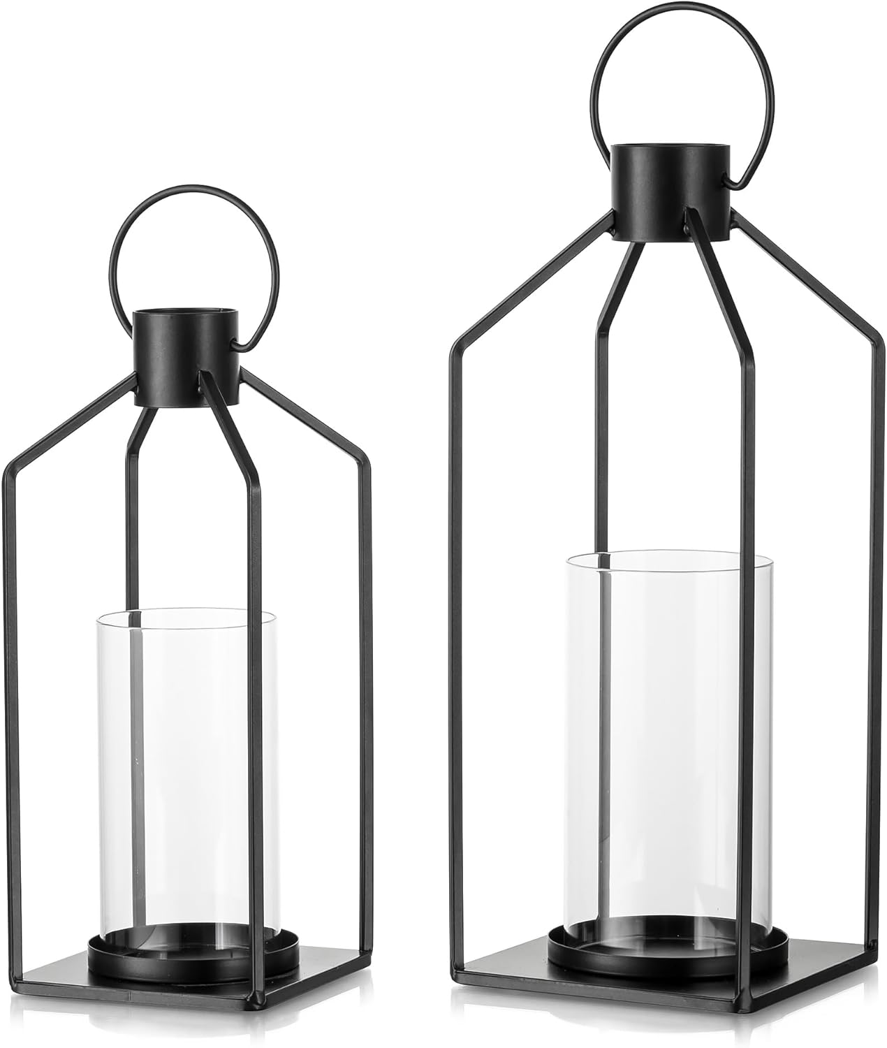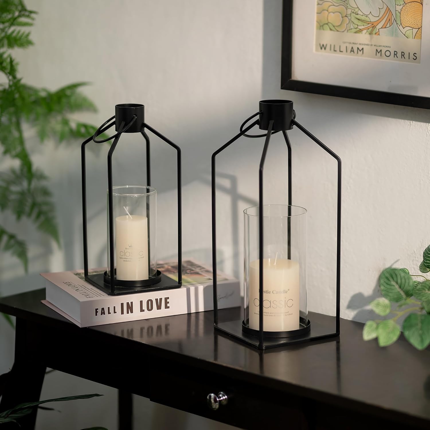 Black Metal Lanterns Decorative Set of 2 – Rustic Farmhouse Iron Candle Holder for Table Centerpiece Fireplace Mantles, Indoor Outdoor 13″ & 11″ Hanging Lantern Home Decor with Clear Glass