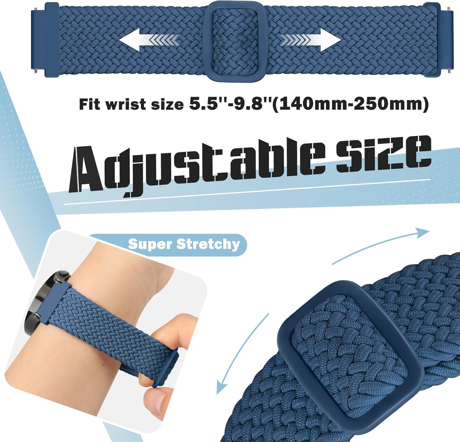 Special Feature: Skin-friendly, Comfortable, Breathable, Durable, Washable, Soft and Lightweight.Suitable Wrist Size: For wrist sizes of 5.5–9.8 inches (140mm-250mm).NOTE: 18mm, 20mm, 22mm refers to the width of lugs, not the width of the strap. Please measure the size before purchasing!!!