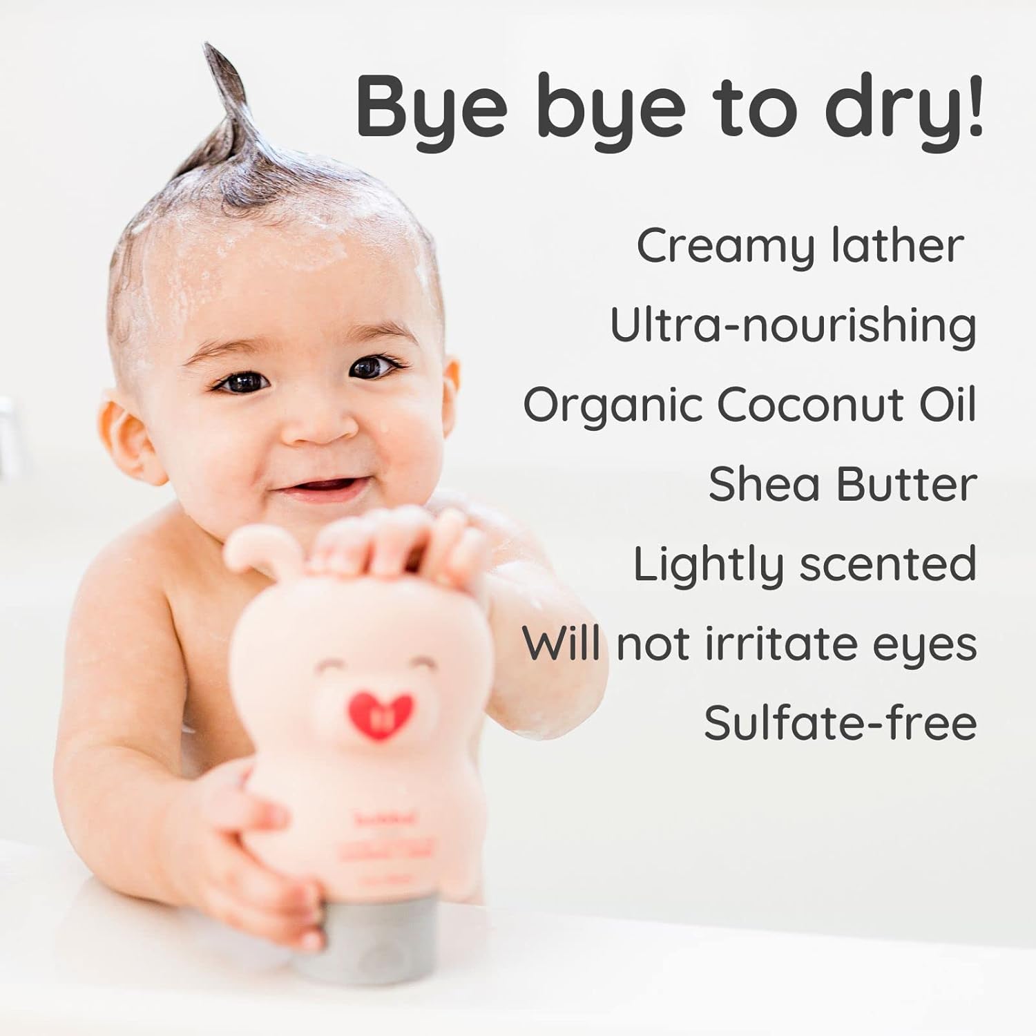 DEEP MOISTURE FOR BABY’S DELICATE SKIN: Our creamy Shampoo + Wash is made with high levels of organic, cold-pressed Coconut Oil and Shea Butter to gently cleanse baby’s skin and hair, while leaving it soft, snuggly, and never dry. A third of this formula is nourishing butters and oils, creating a rich lather. Won’t irritate eyes and specially formulated for newborns without harsh sulfates.