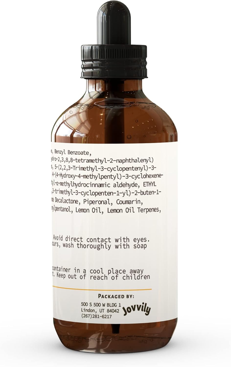 Jovvily Cashmere Vanilla & Peach Fragrance Oil in an amber 4 fl oz bottle with a dropper cap