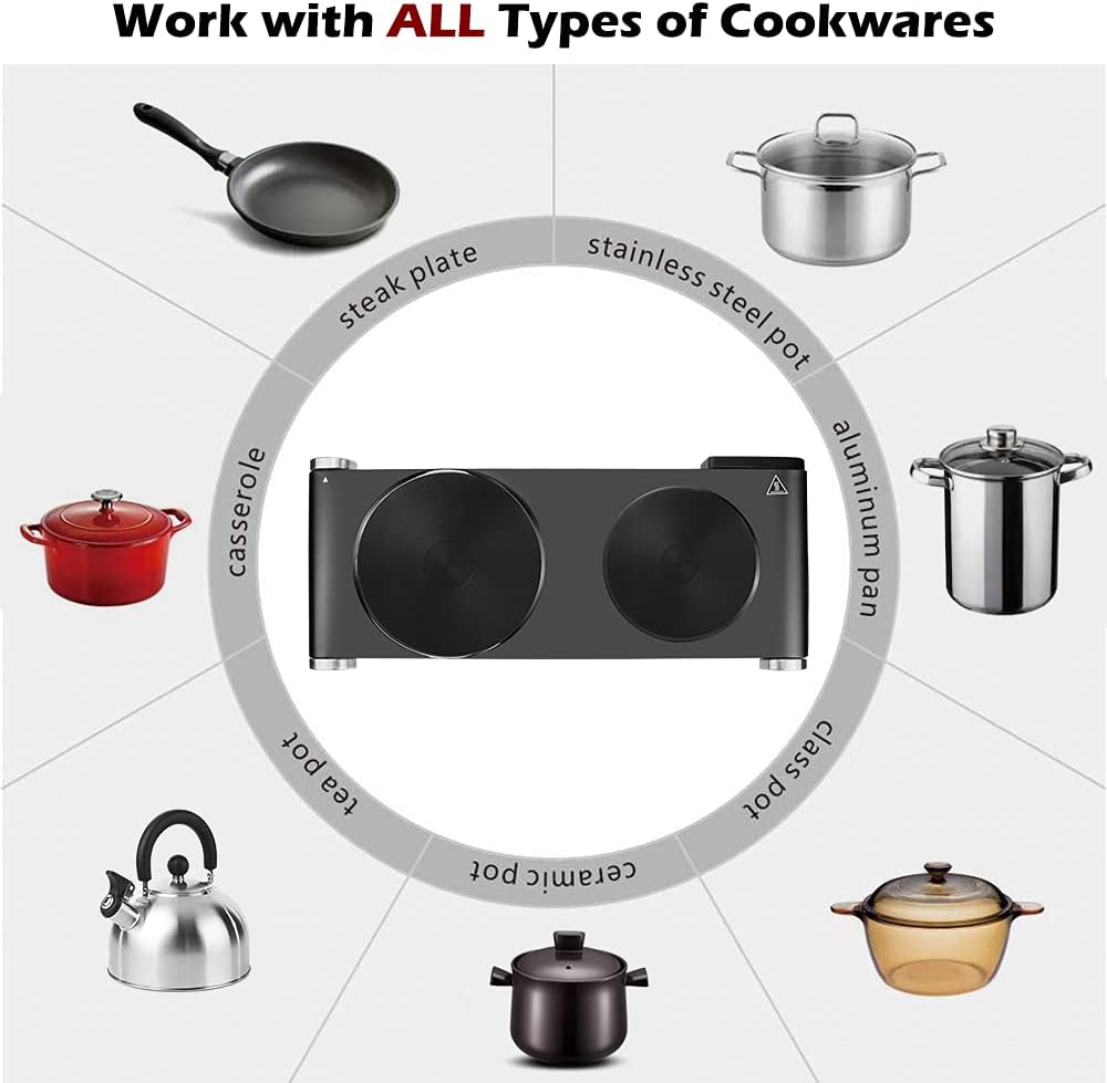 [All Types Of Cookware]–CUSIMAX Double Hot Plate is suitable for All Type of Cookware. Compatible with pots and pans with maximum size of 7.4 + 6.1 inches. Works with glass and aluminum and heats cookware efficiently with minimal heat loss.