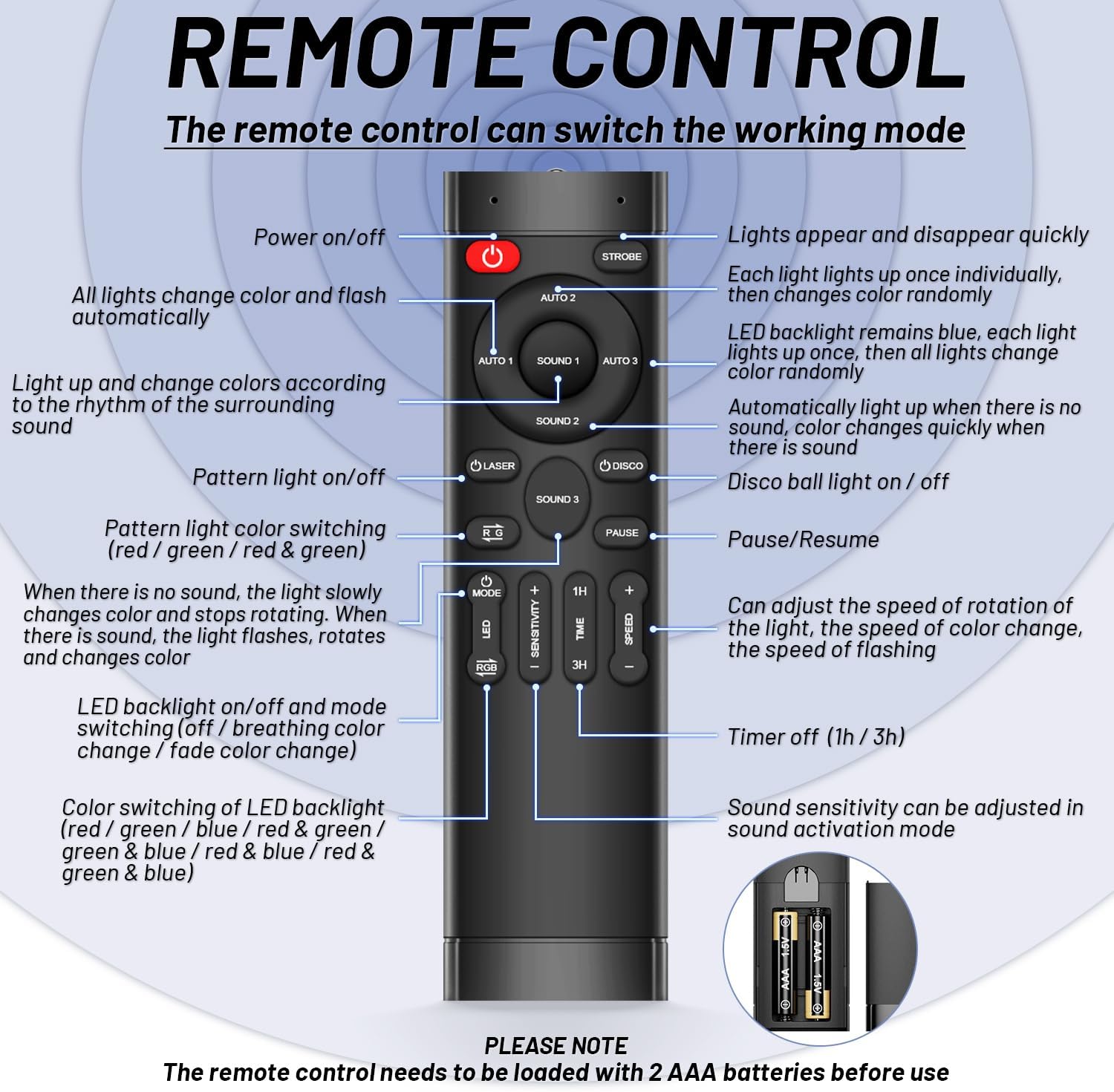 3 Sound activated modes + 3 Auto modes + flash mode, you can use the remote control to switch working modes and pause lighting effects. Different working modes make your dance party more wonderful.