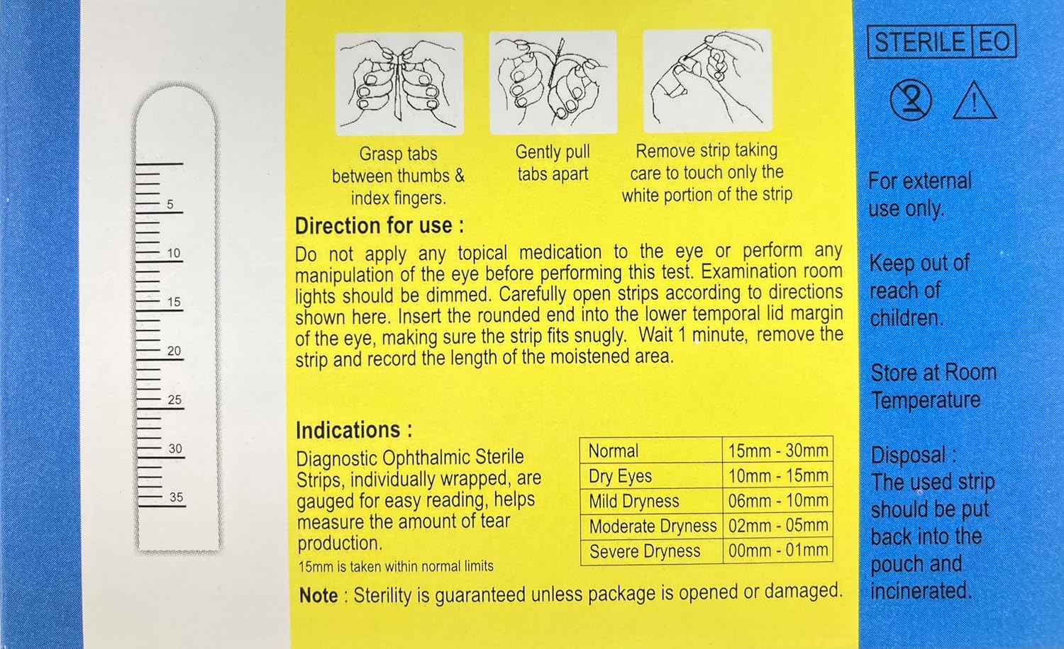 Each calibrated strip is easy to read; The blue dye wicks up the scale, creating better visibility when measuring your pet’s tear production; Designed with a color bar tear front indicator and a millimeter scale on the strip; Insert the rounded end into the lower temproal lid margin of the eye, making sure the strip fits snugly; Wait 1-minute, remove the strip and record the length of the moistened area