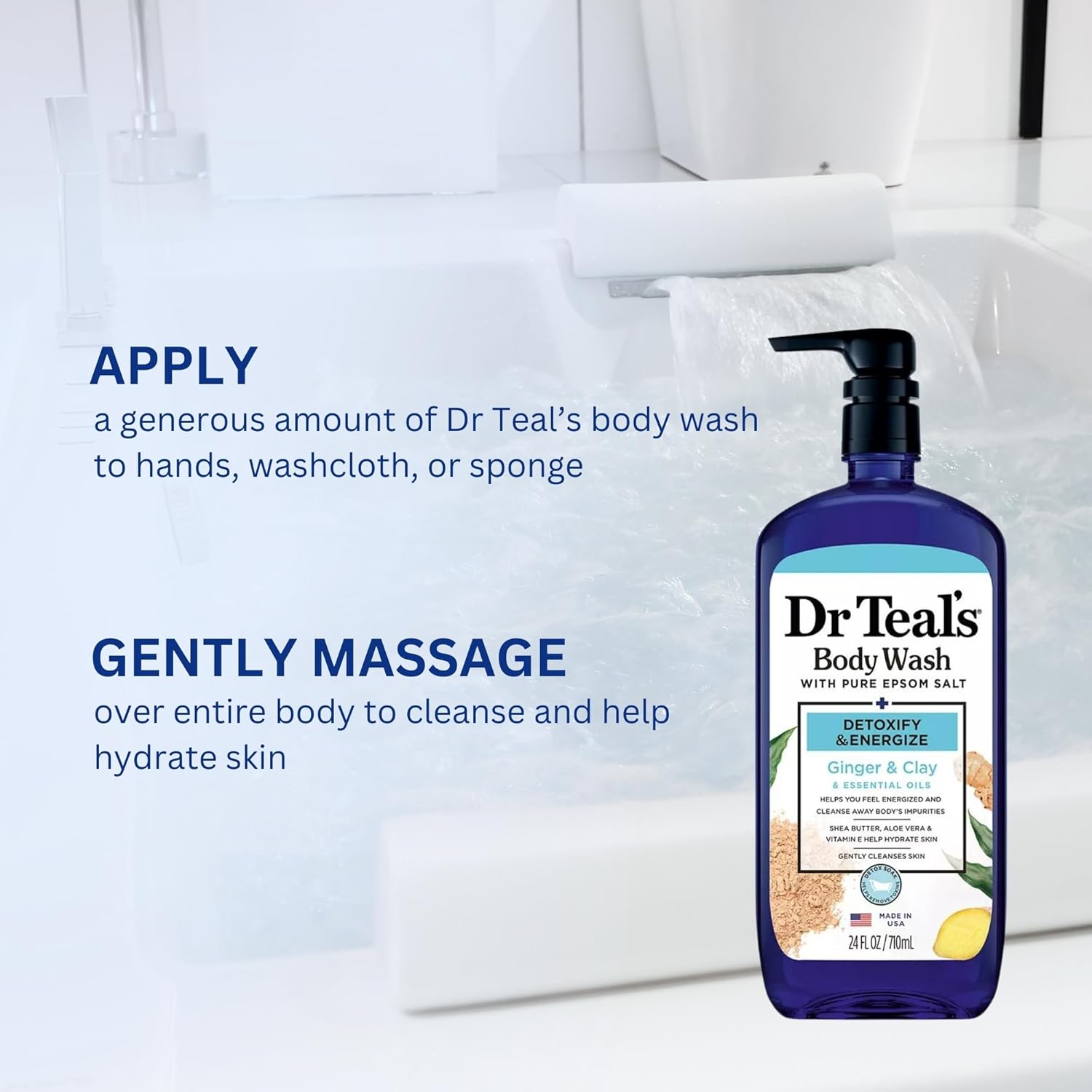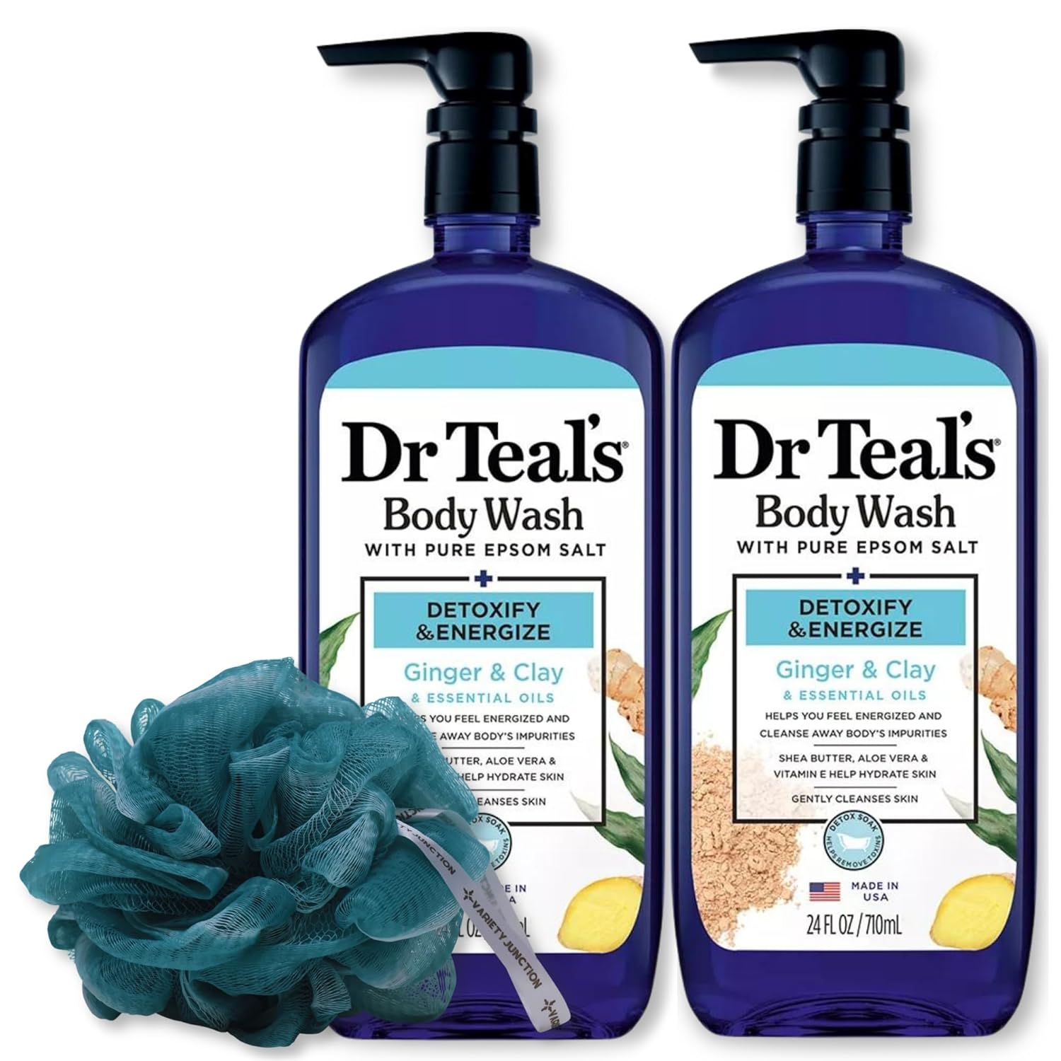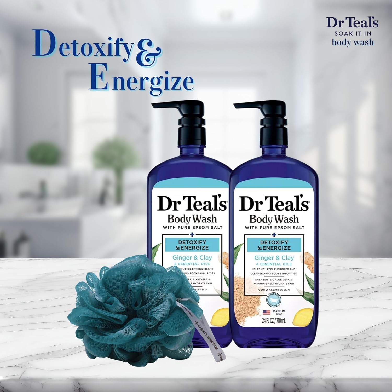 Dr. Teal’s Detoxify and Energize Body Wash 24oz (Pack of 2) w Premium Bath and Shower Sponge – Refreshing & Revitalizing, Ginger and Clay Essential Oils, Men’s and Women’s