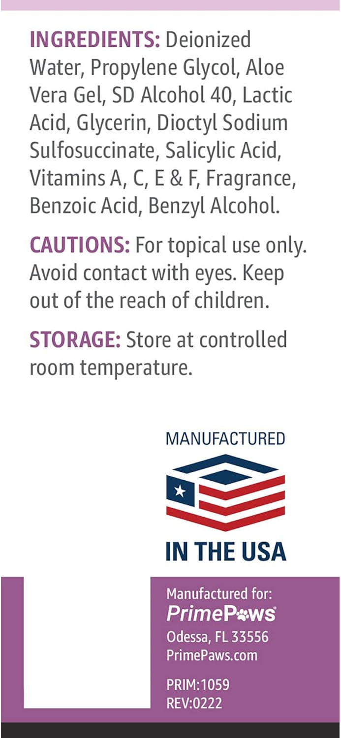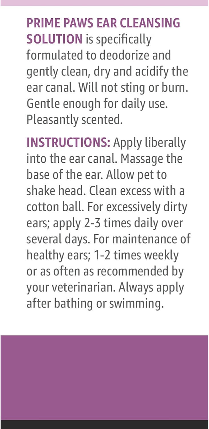 About Prime Paws Ear Cleansing Solution for Dogs and Cats Prime Paws Ear Cleansing Solution gently and effectively flushes the ear canal to help reduce odor. The deep-cleansing formulation acidifies the area to help prevent organic growth, flushes our debris and dead skin, and helps reduce bad ear odor. From Pug to Sphinx, this cleanser is made for all canine and feline breeds of all ear sizes. Along with moisturizing Glycerin, Aloe vera gel is an essential and unique ingredient in this cat and dog ear solution; this viscous ingredient thickens the formula, which helps properly coat the ear canal to evenly distribute cleansing ingredients for a more effective otic flush. Salicylic Acid, Lactic Acid, and Benzoic Acid also help cleanse pores, remove dead skin, and create an inhospitable environment for invasive organic growth. Nano-encapsulated vitamins A, C, E, and F work synergistically to replenish moisture and to nourish the skin. The process of nano-encapsulating vitamins helps ensure absorption and effectiveness in cat and dog ear care. The gentle flushing action of this effective dog and cat ear cleaner cleanses the area of dead skin, loose fur, debris, waxy buildup, and excess oils, all of which can contribute to serious otic concerns. This liquid ear cleaner for dogs and cats is easy to use for all breeds and ear types over 12 weeks old; simply apply liberally, let pet shake their head, massage the base of the ear, and wipe away excess. This cat and dog ear cleaner solution will not sting, making it great for pets with sensitive skin. Reach for Prime Paws Ear Cleaning Solution for Dogs and Cats for reliable and natural pet otic care.