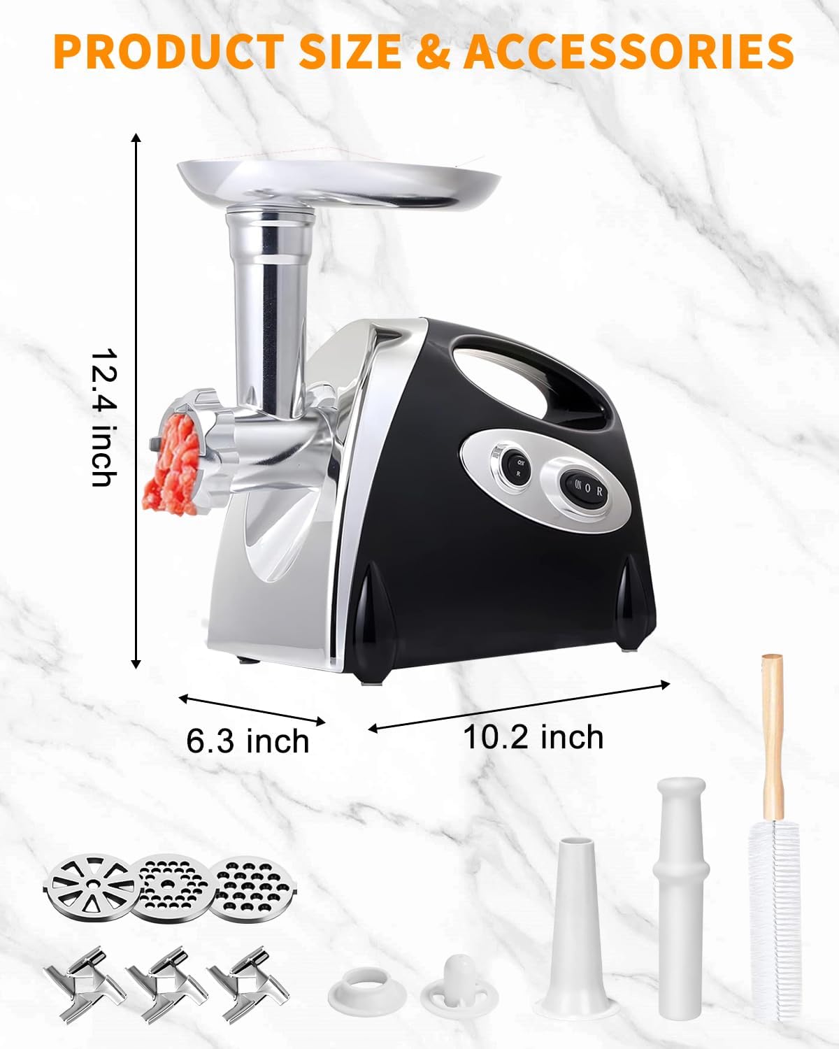【VERSATILE MEAT GRINDER】This all-in-one food grinder includes 3 cutting blades, 3 different size grinding plates, 1 sausage kit, 1 kubbe attachment, 1 food pusher and additional cleaning brush. The machine functions as a meat grinder, sausage stuffer, and kubbe maker, offering versatility in your kitchen tasks. Crafted with sharp and durable 420 stainless steel blades and plates, it is perfect for grinding a variety of foods such as beef, chicken, garlic, chili, and more.