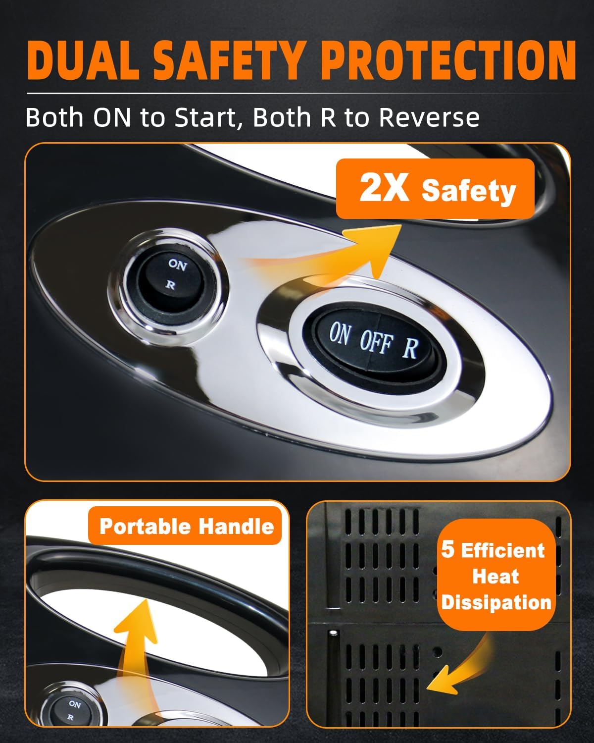 【SAFETY DUAL PROTECTION & PORTABLE HANDLE DESIGN】The meat grinder is equipped with dual buttons,enhancing 2X safety protection. To initiate operation, adjust both switches to the ON position; for reverse functionality, switch them to the R position to clear any blockages.