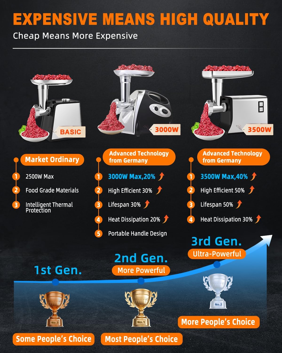 Electric Meat Grinder: [3000W Superior Motor] [Ultra-Intelligent Thermal Protection] Meat Grinder with 6 PCS Stainless Steel Blades & Grinding Plates, Sausage Stuffer Tubes & Kubbe Kit Portable Handle
