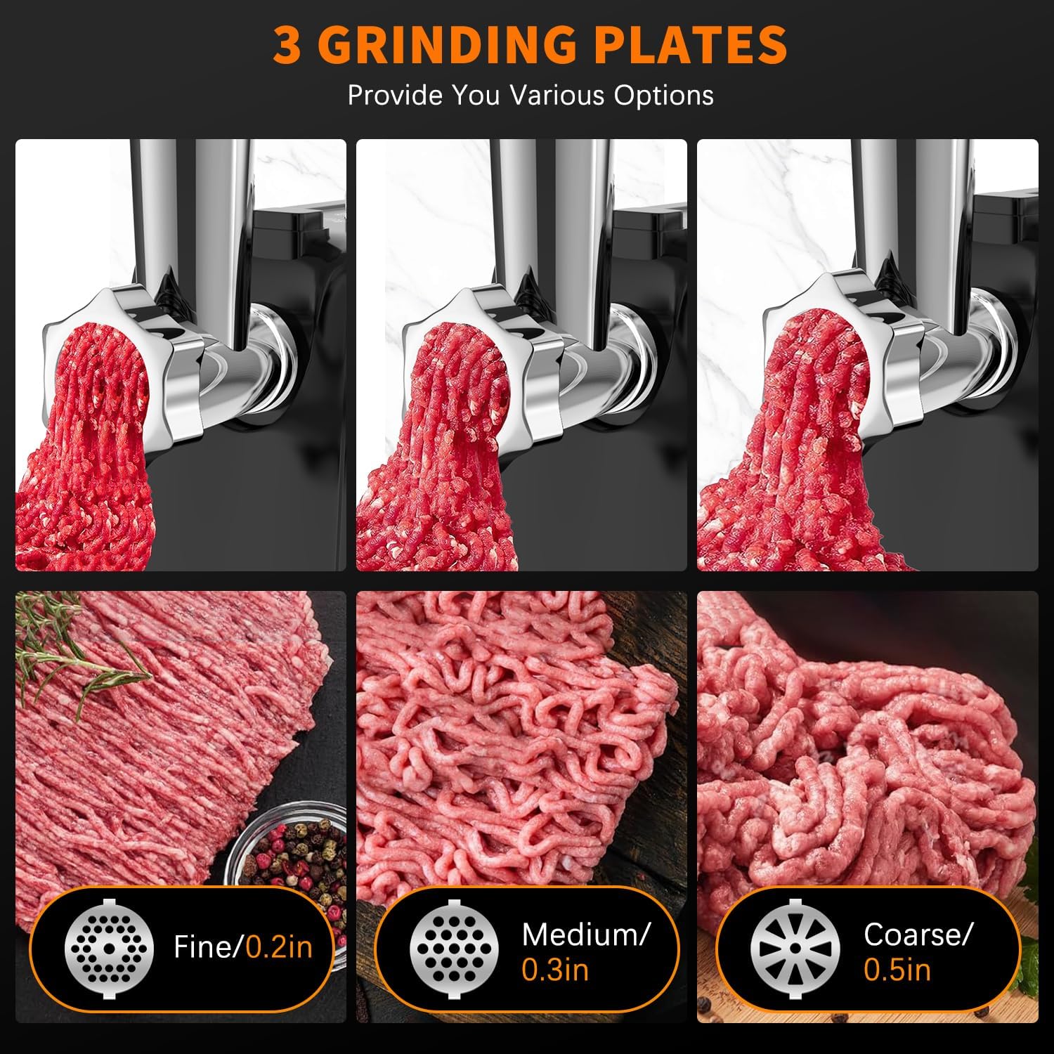 【SUPERIOR POWERFUL&UPGRADED MOTOR】NOTES: BE SURE NOT TO INCLUDE TOO MANY TENDONS. SVKLHY electric meat grinder features a robust motor (3000W MAX, 20% More Powerful), enabling you to quickly grind large quantities of meat. Its high efficiency saves you time and effort, making it an indispensable tool for home cooks and professional chefs alike. Ideal for beef, chicken, pork, fish, and more, this versatile meat grinder is a must-have for any kitchen.