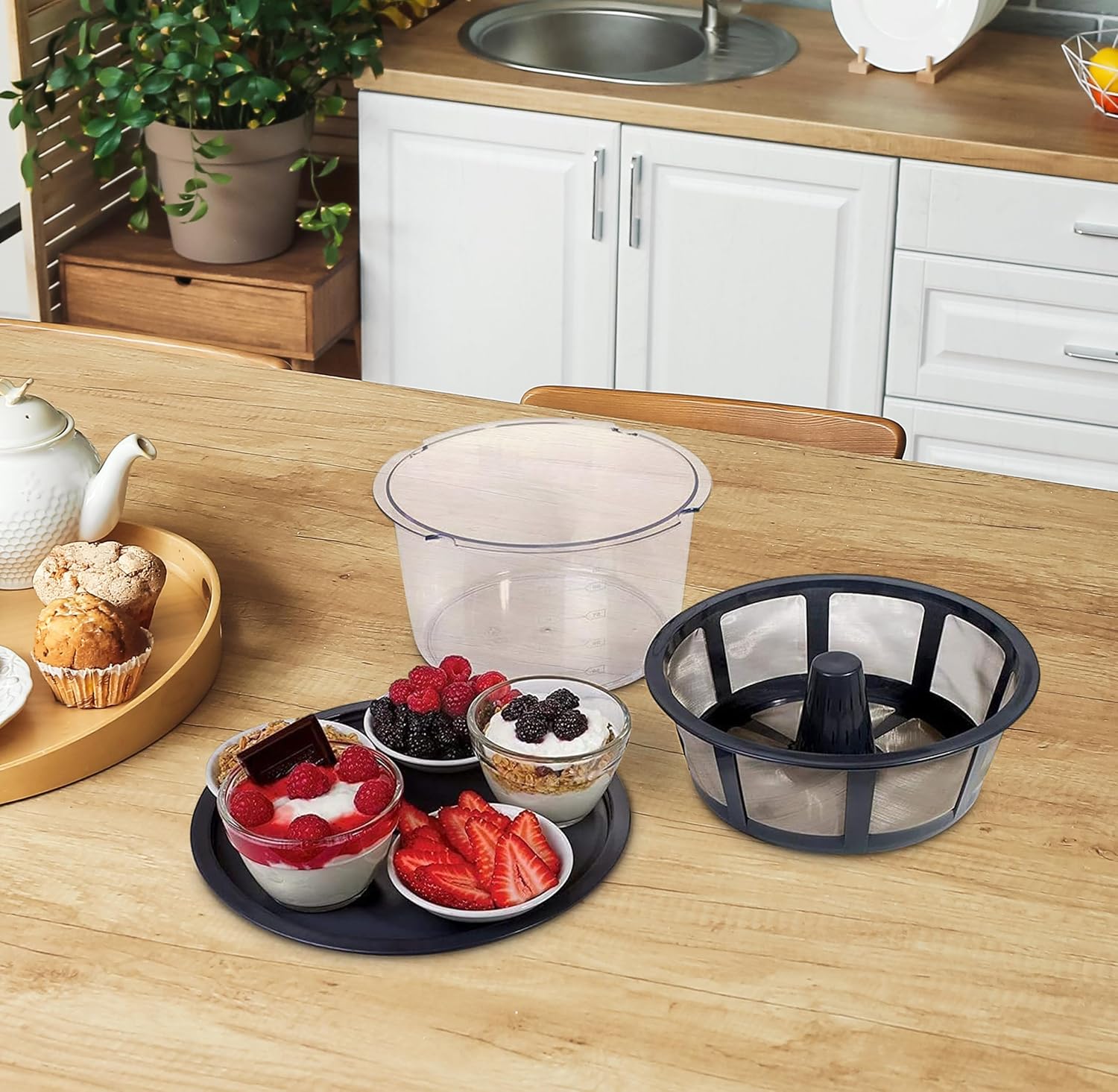 Includes – 64 Ounce capacity acrylic yogurt bowl with imprinted measurements, High Quality BPA free stainless steel strainer basket, a lid which doubles as a serving tray, and Many tried and tested recipes