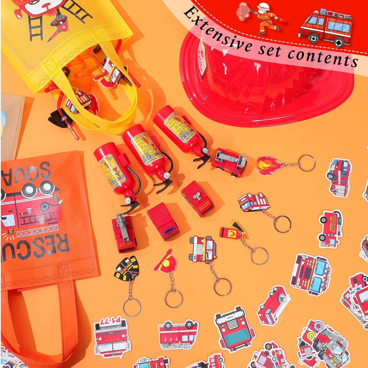 Firefighter Party Supplies for Boys Including Fire Truck Toy Helmets Nonwoven Bag Mini Firemen Squirter Straw Sticker Keychain for Fireman Birthday Party Supplies Gift (24 Sets)