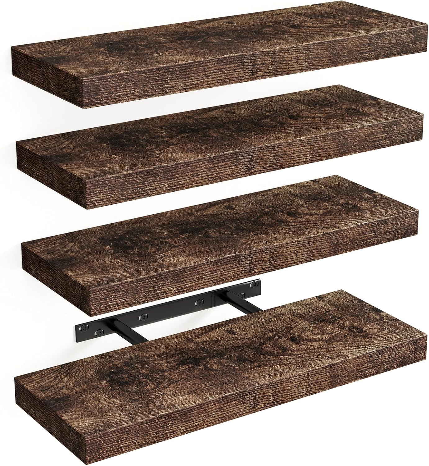 Fixwal 15.8in Floating Shelves, Rustic Wood Finish Wall Shelves Set of 4, Shelves for Wall Decor, with Invisible Brackets for Bathroom, Living Room,Bedroom and Kitchen(Rustic Brown)