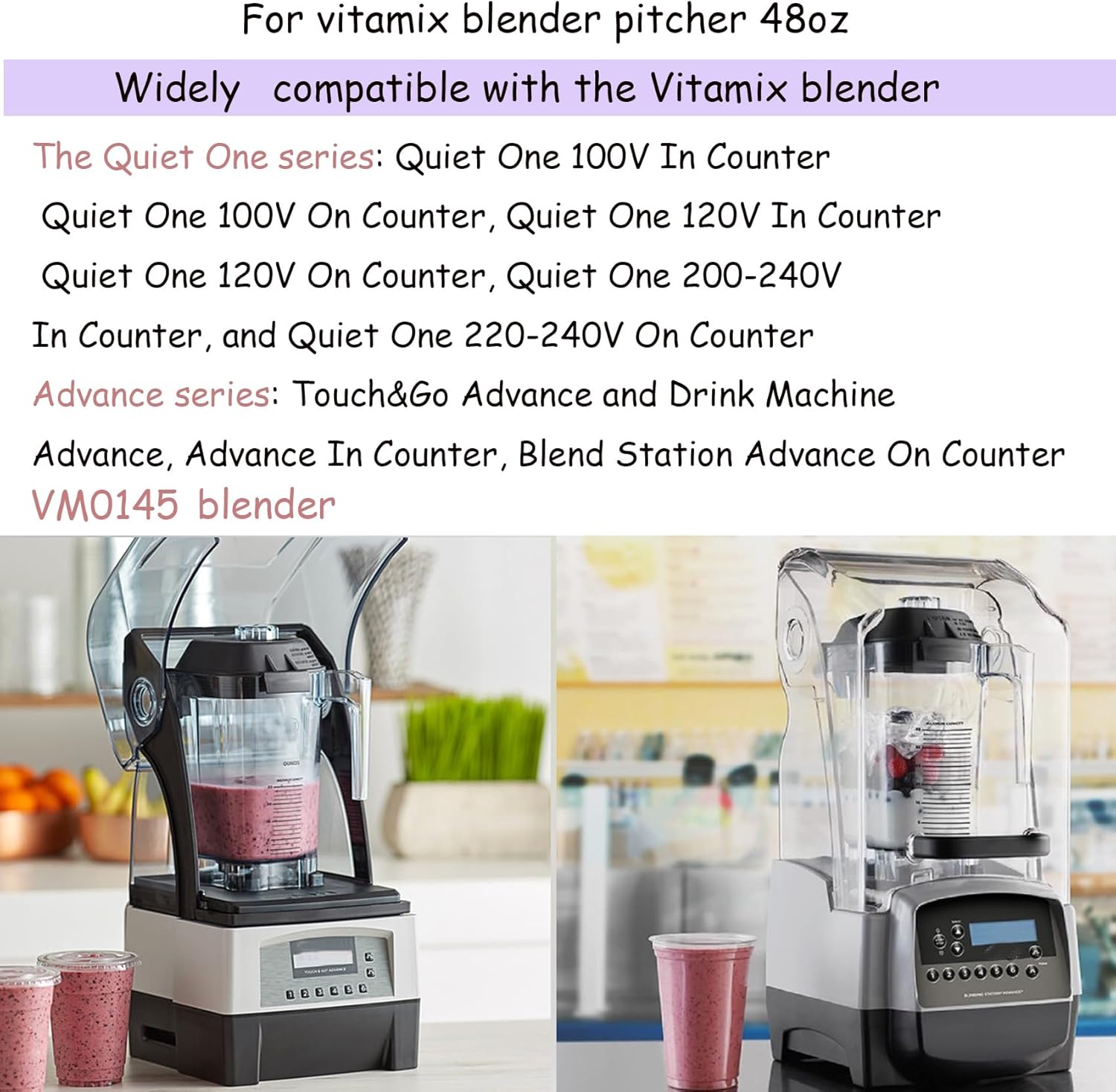 Wide compatibility: Our 48oz container is compatible with Vitamix VM0145 The Quiet One series: Quiet One 100V In Counter, Quiet One 100V On Counter, Quiet One 120V In Counter, Quiet One 120V On Counter, Quiet One 200-240V In Counter, and Quiet One 220-240V On Counter. Advance series: Touch&Go Advance and Drink Machine Advance, Advance In Counter, Blend Station Advance On Counter. We welcome you to inquire about the model at any time. If you are unsure if it is compatible.