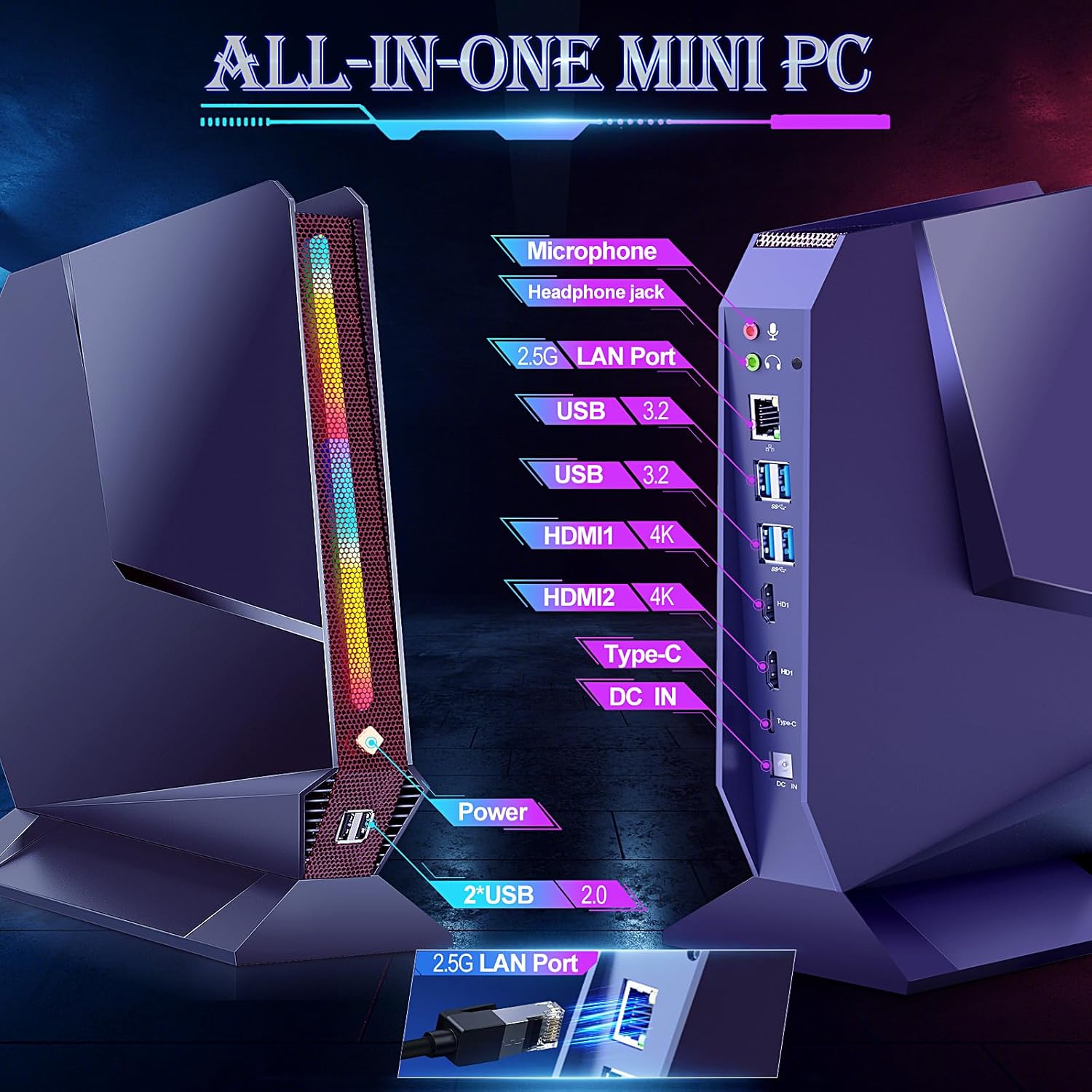 Our Sinbun gaming Mini PC uses High Cooling with a Twin Turbo Smart Fan and copper module Heat Spreader, and mini computer sound under 38 dB. 7 Gradient rainbow colors RGB lights show a very beautiful and Cool color effect.