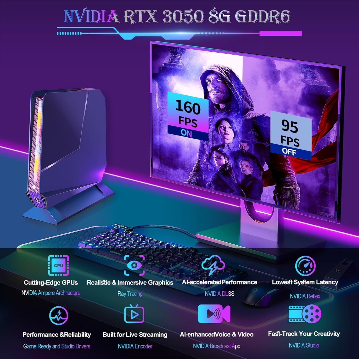 The mini pc gaming nvidia is built in Geforce RTX 3050 8G GDDR6 VRAM, They’re built with the ultra-efficient NVIDIA Ada Lovelace architecture. Experience fast ray tracing, AI-accelerated performance with DLSS 3, Capture and share videos, screenshots, and livestreams with friends, etc. quick processing and offer you performance at great value.