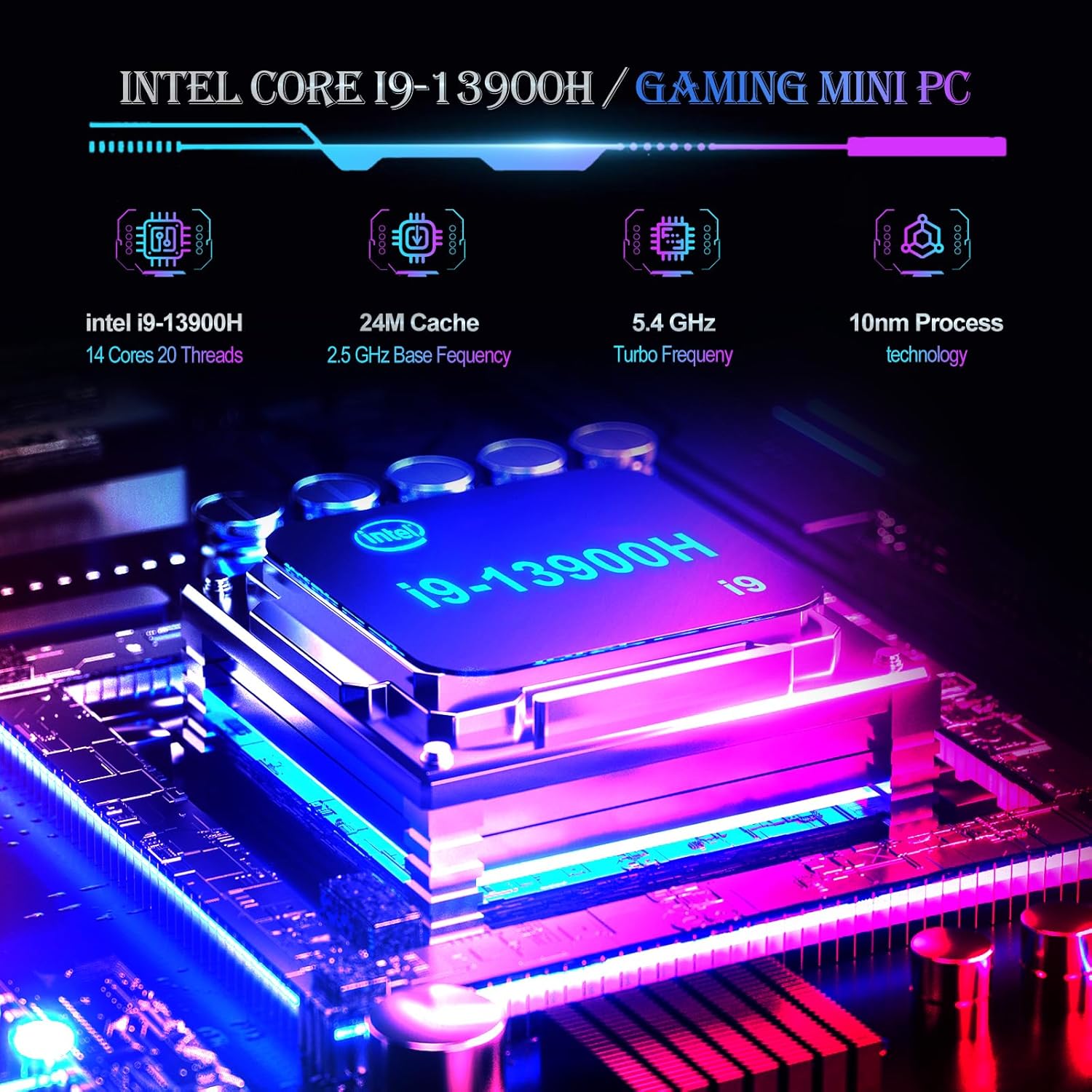 The 13th gen intel mini pc i9-13900H 2.6 GHz (5.4 GHz) CPU delivers the ultimate performance. With 16 Performance Cores, 20 efficient Cores and 24 processing threads, whether you’re playing the latest games, Rendering Design, or crunching data, this CPU will be able to tackle any tasks.